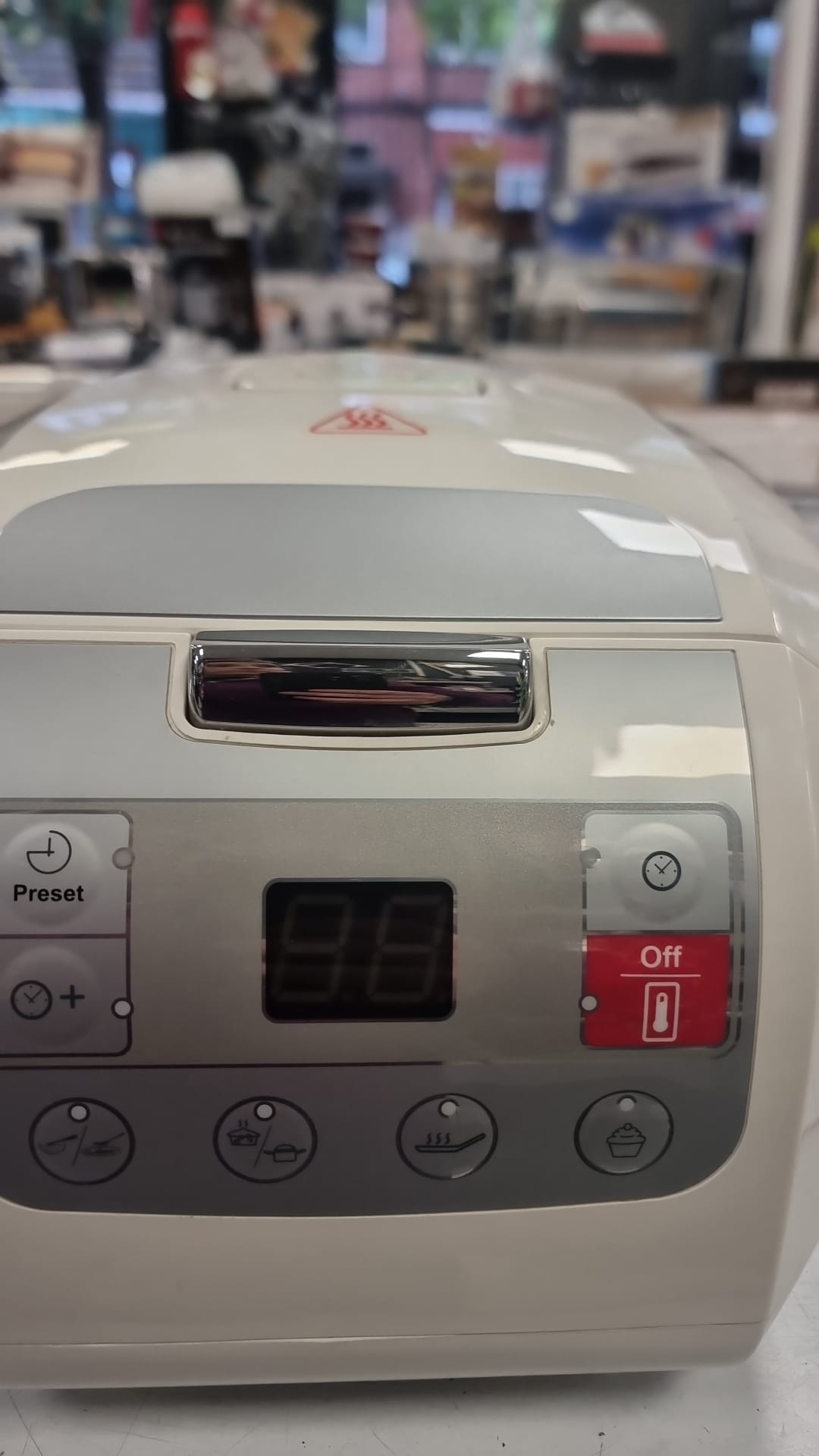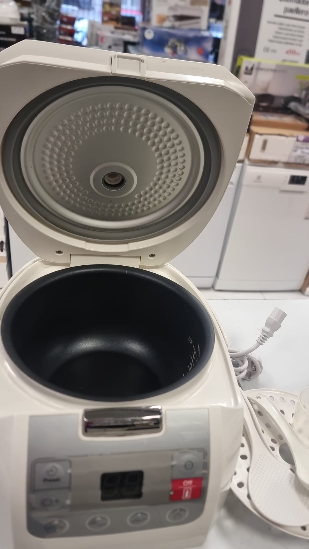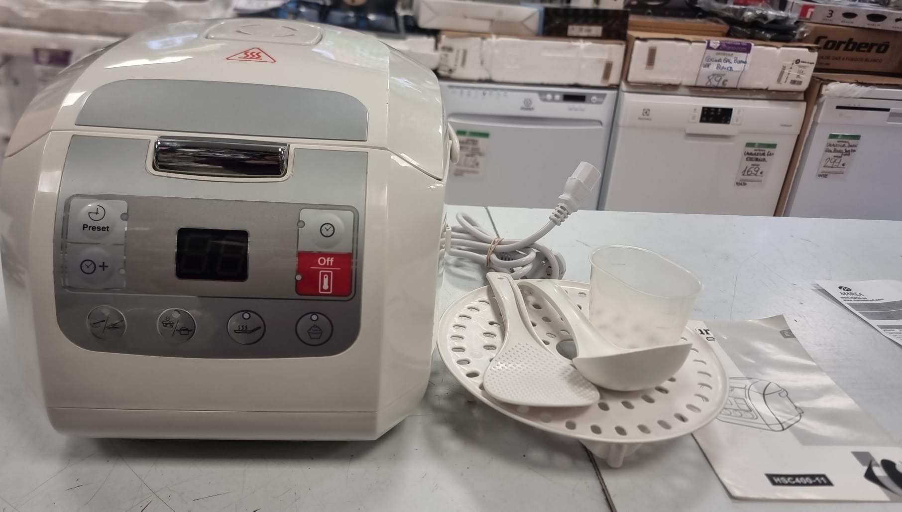 Robot de cocina Carrefour Home modelo HSC 400-11. Incluye accesorios. Robot de cocina blanco y gris. Panel de control con pantalla digital. Accesorios: vaso medidor, espátula y cucharón.