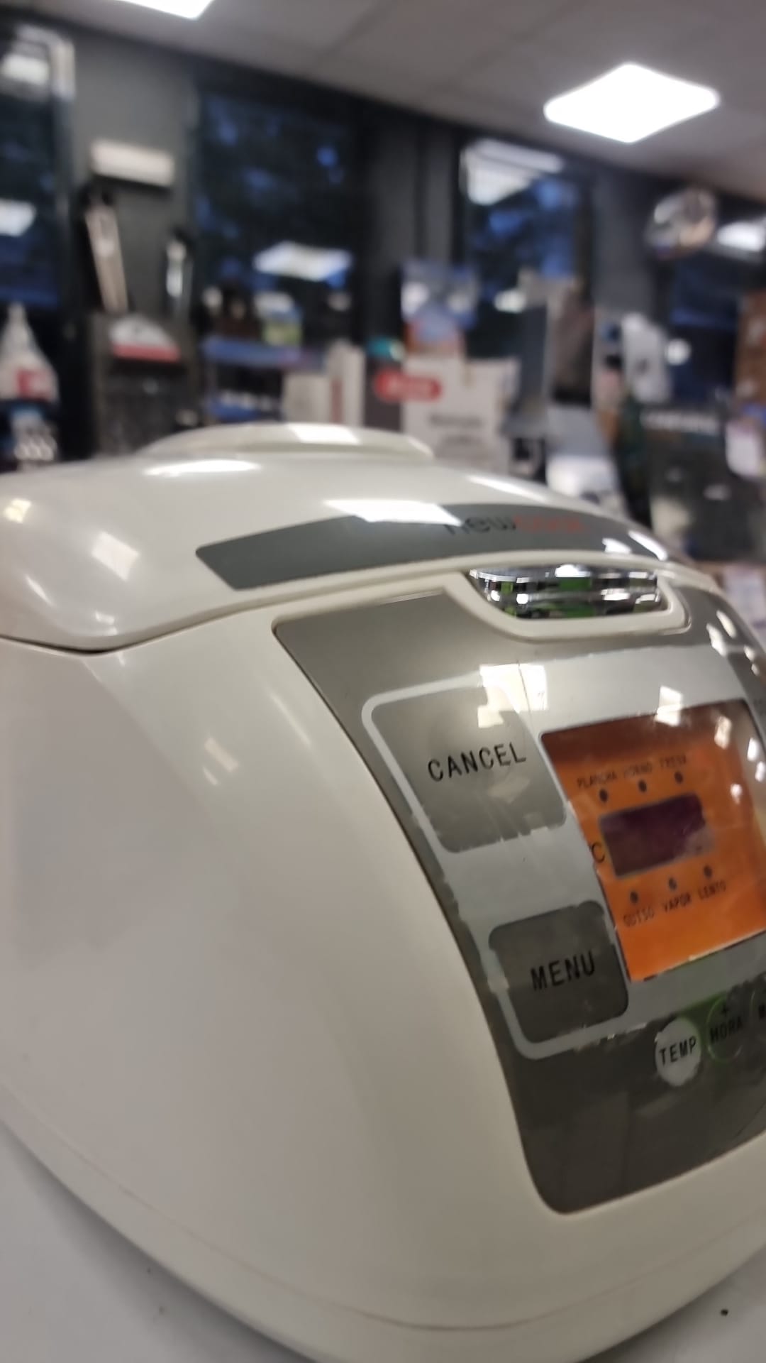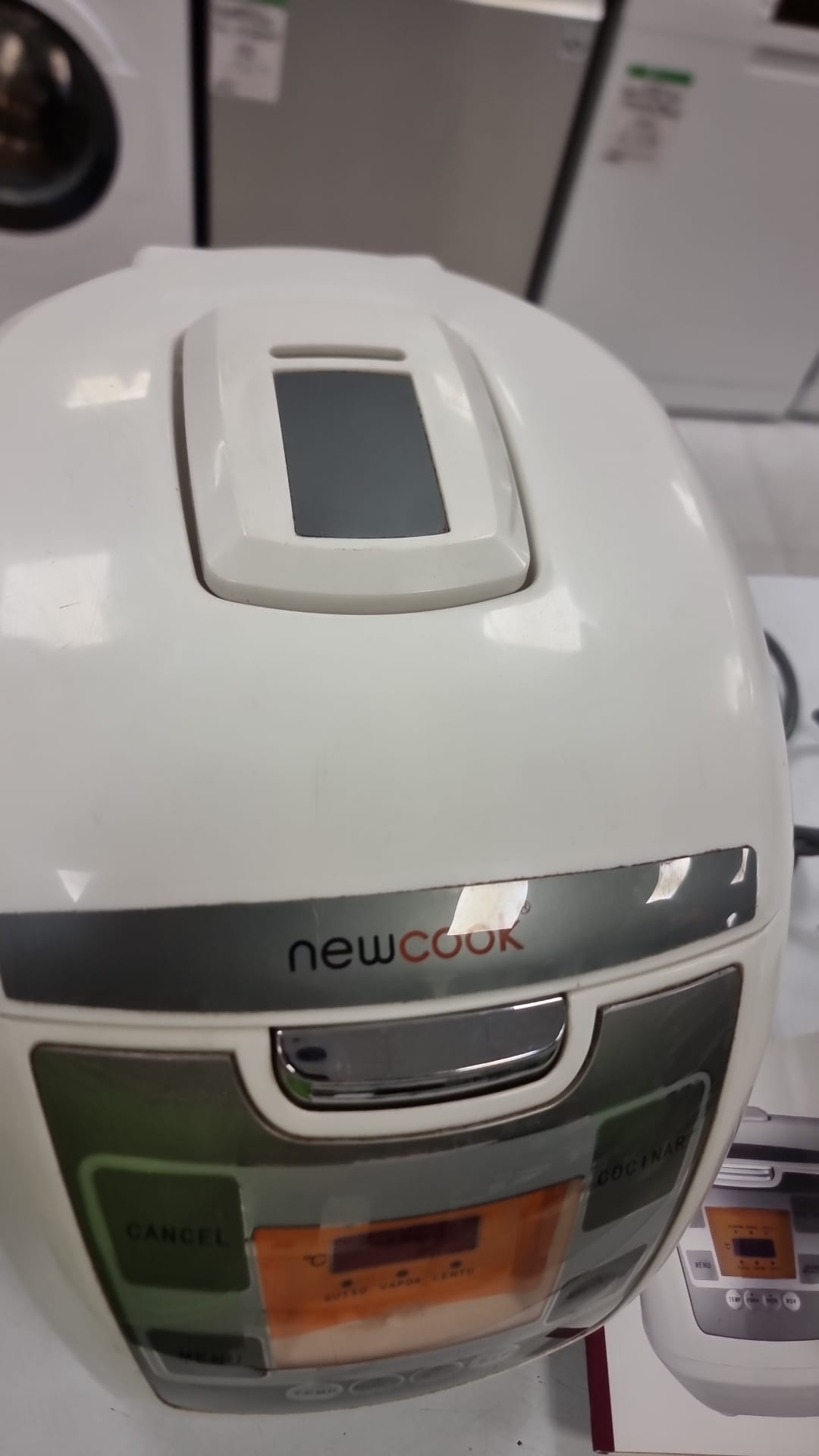 Robot de cocina Newcook con capacidad de 5 litros. Modelo CFXB70A. Panel de control con pantalla.Botones de función: Cancelar, Cocinar, Menú. Indicador de temperatura. Signos visibles de uso.