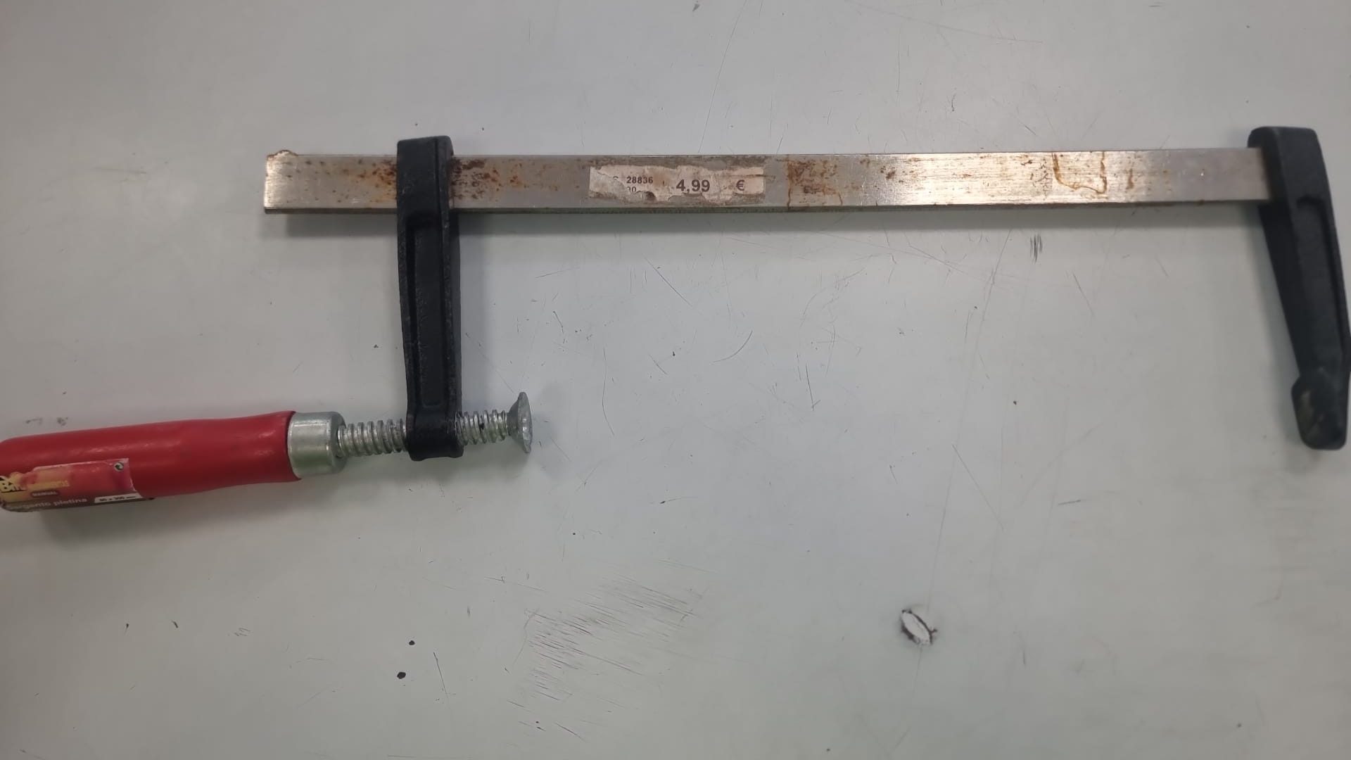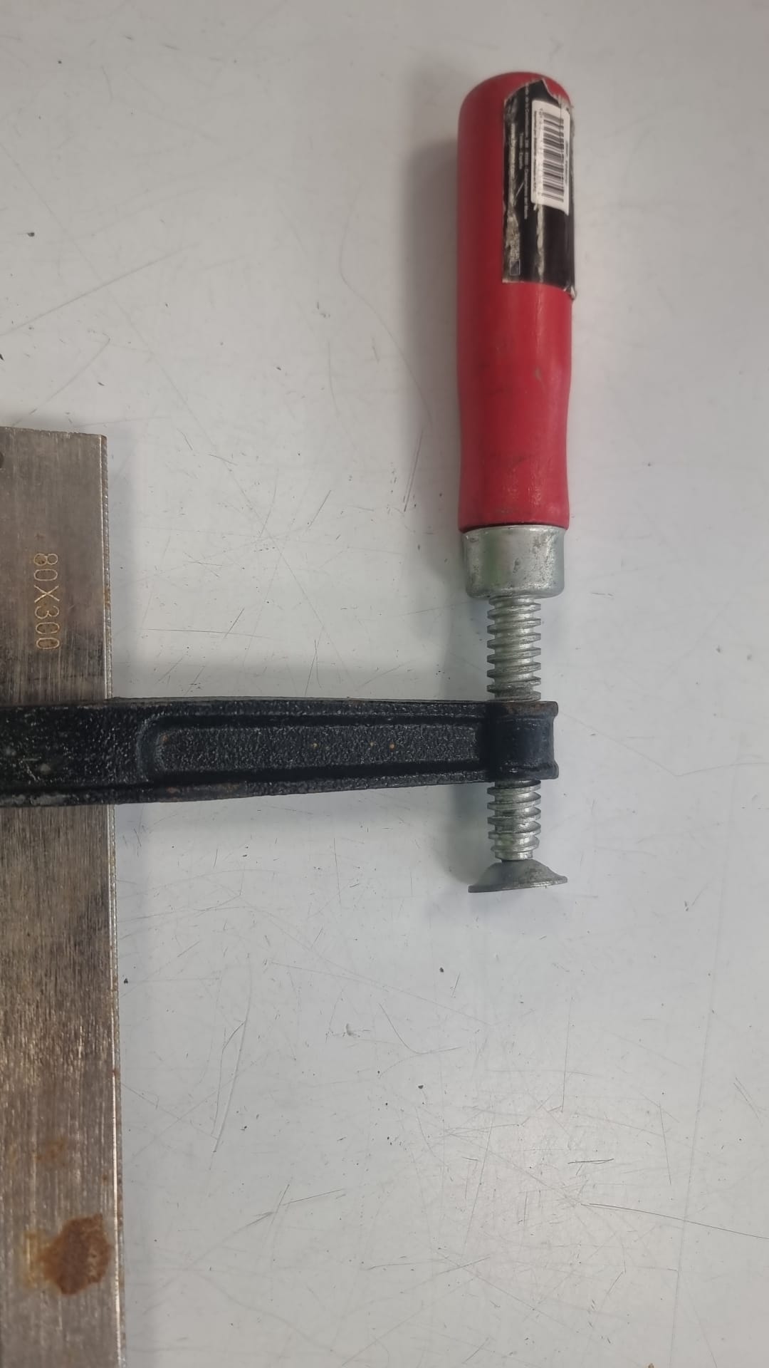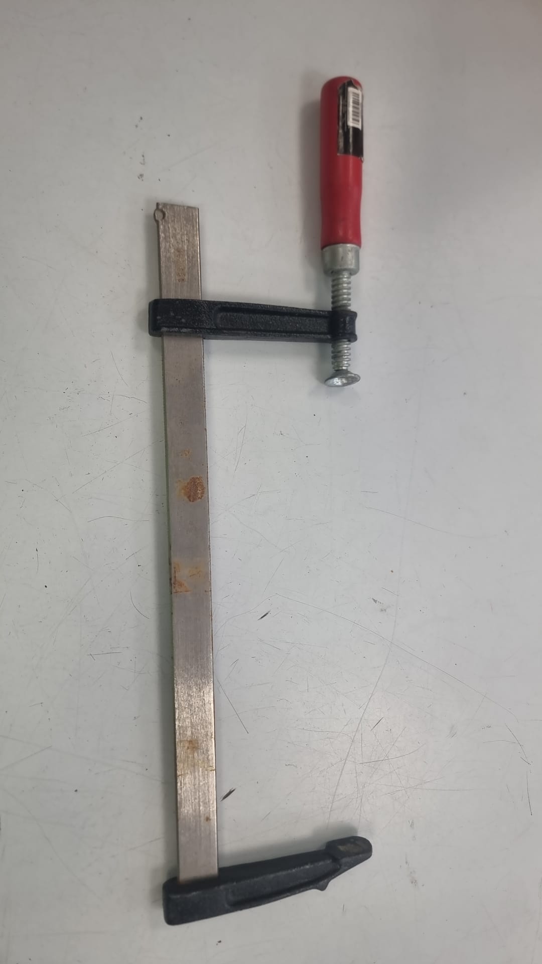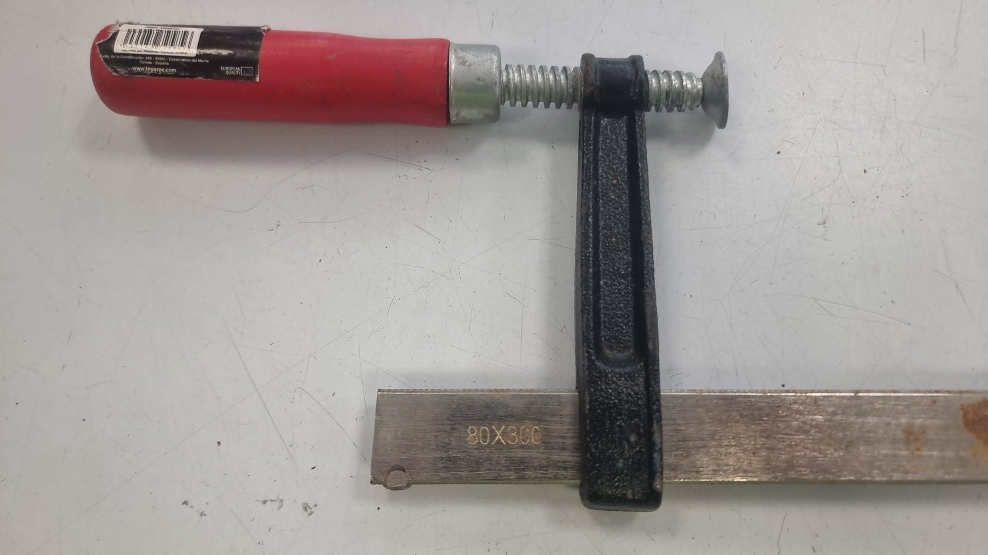 Se vende sargento de carpintero de 300mm. Está algo usado, pero en buen estado. Medida: 300mm. Material de la barra: Metal. Mango: Rojo