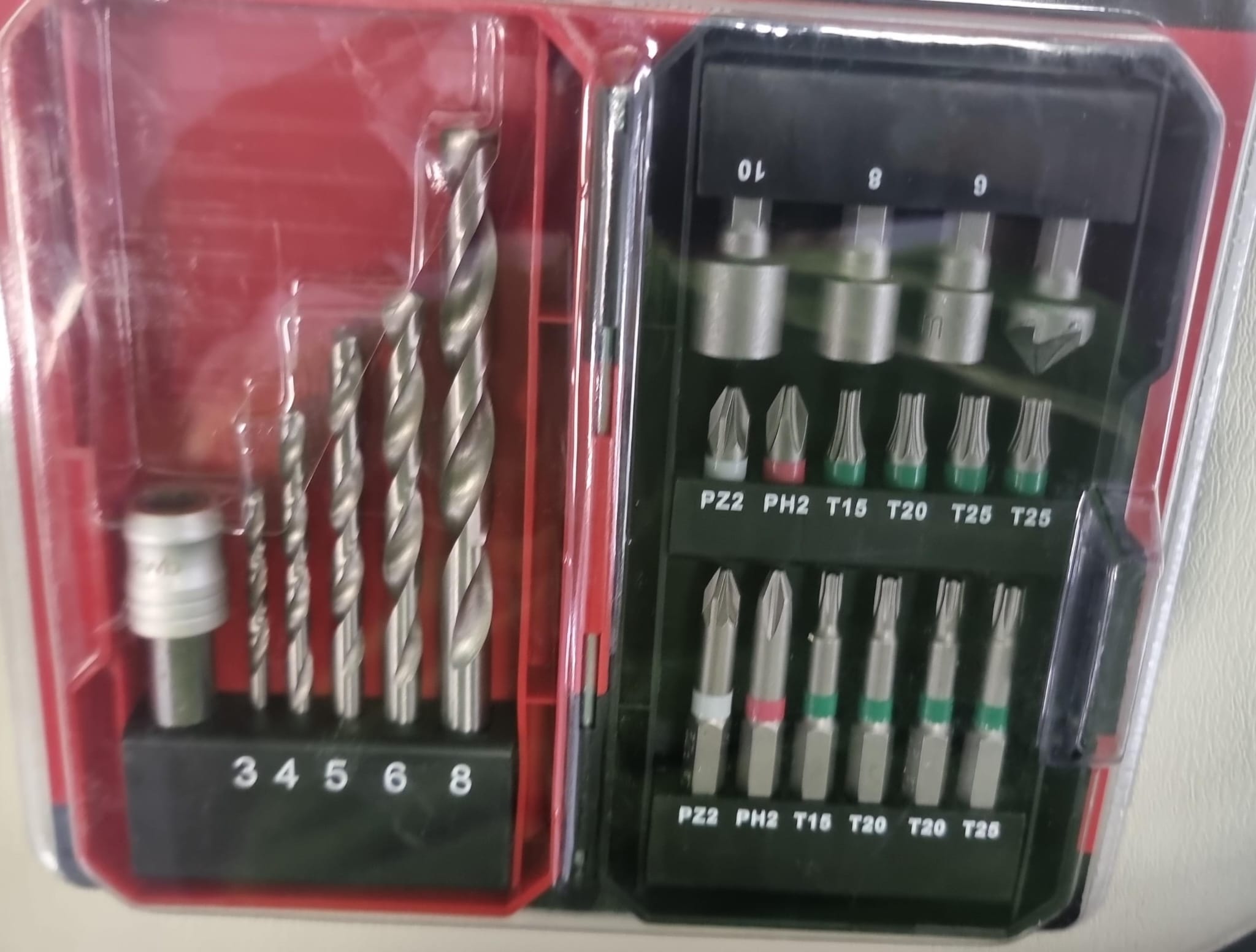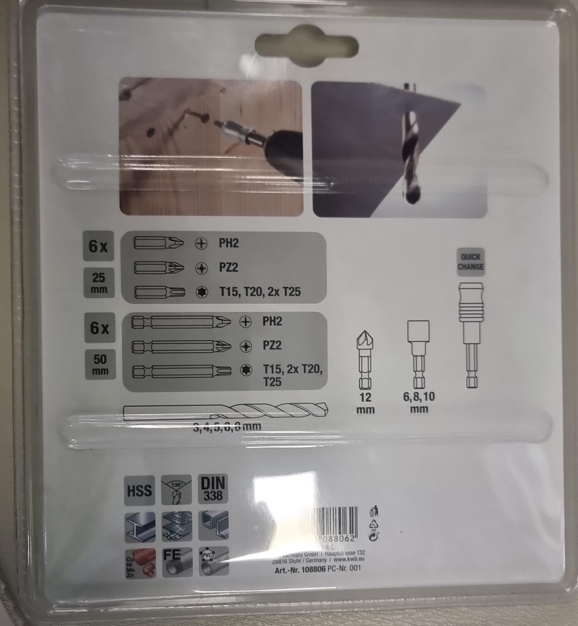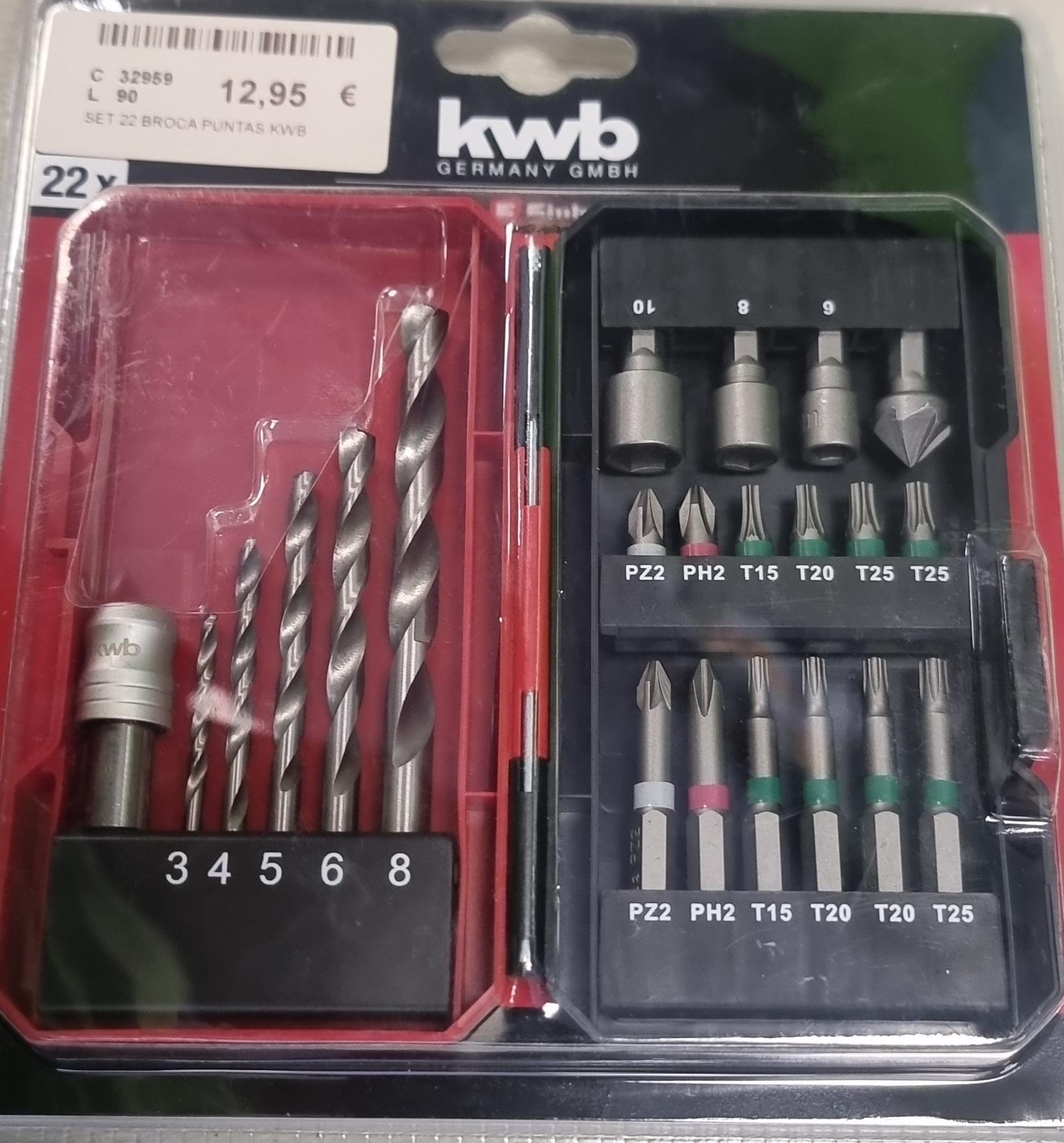 Juego de 22 brocas y puntas de atornillar KWB. Incluye llaves de vaso de 6, 8 y 10mm y un avellanador. Set de 12 puntas las más comunes (PH-PZ-TORX) y 10 brocas HSS 118º para metal de 3, 4, 5, 6 y 8mm. Cuenta con 6 puntas con 25mm y 6 puntas con 50mm para llegar también hasta tornillos muy profundos con un portapunta rápido. Puntas fabricadas en Cromo Vanadio.