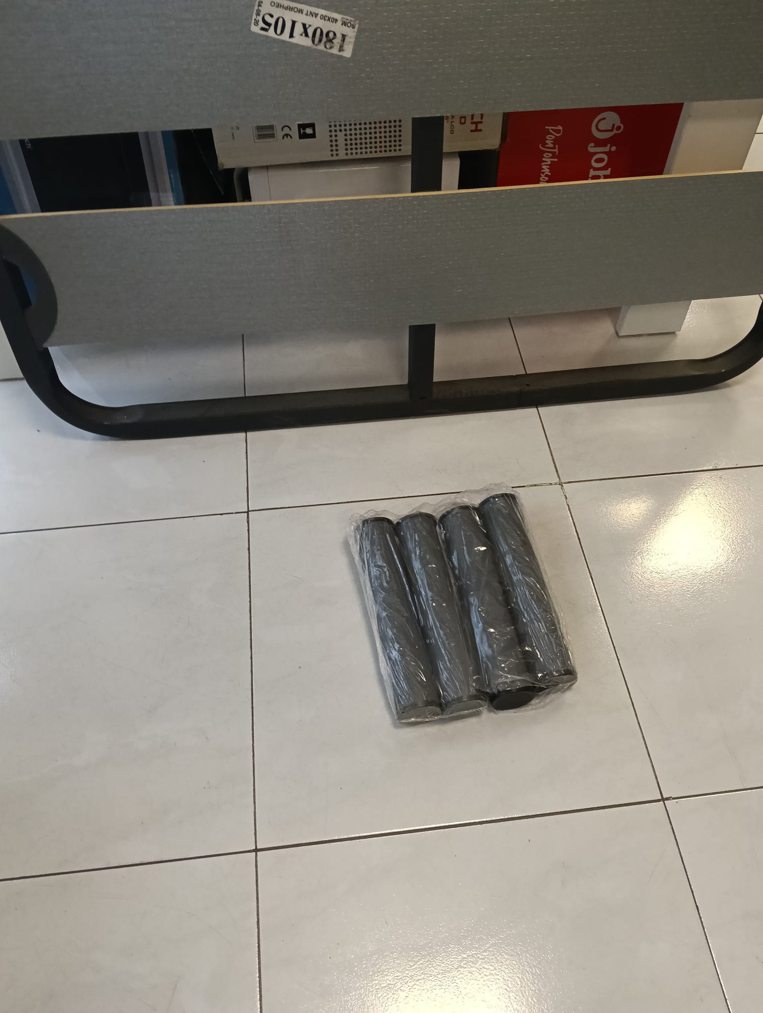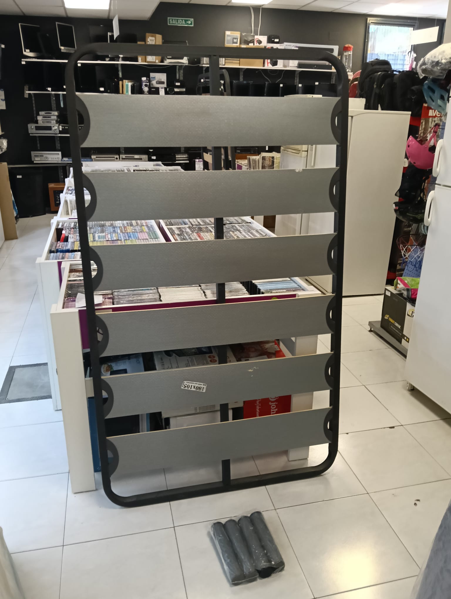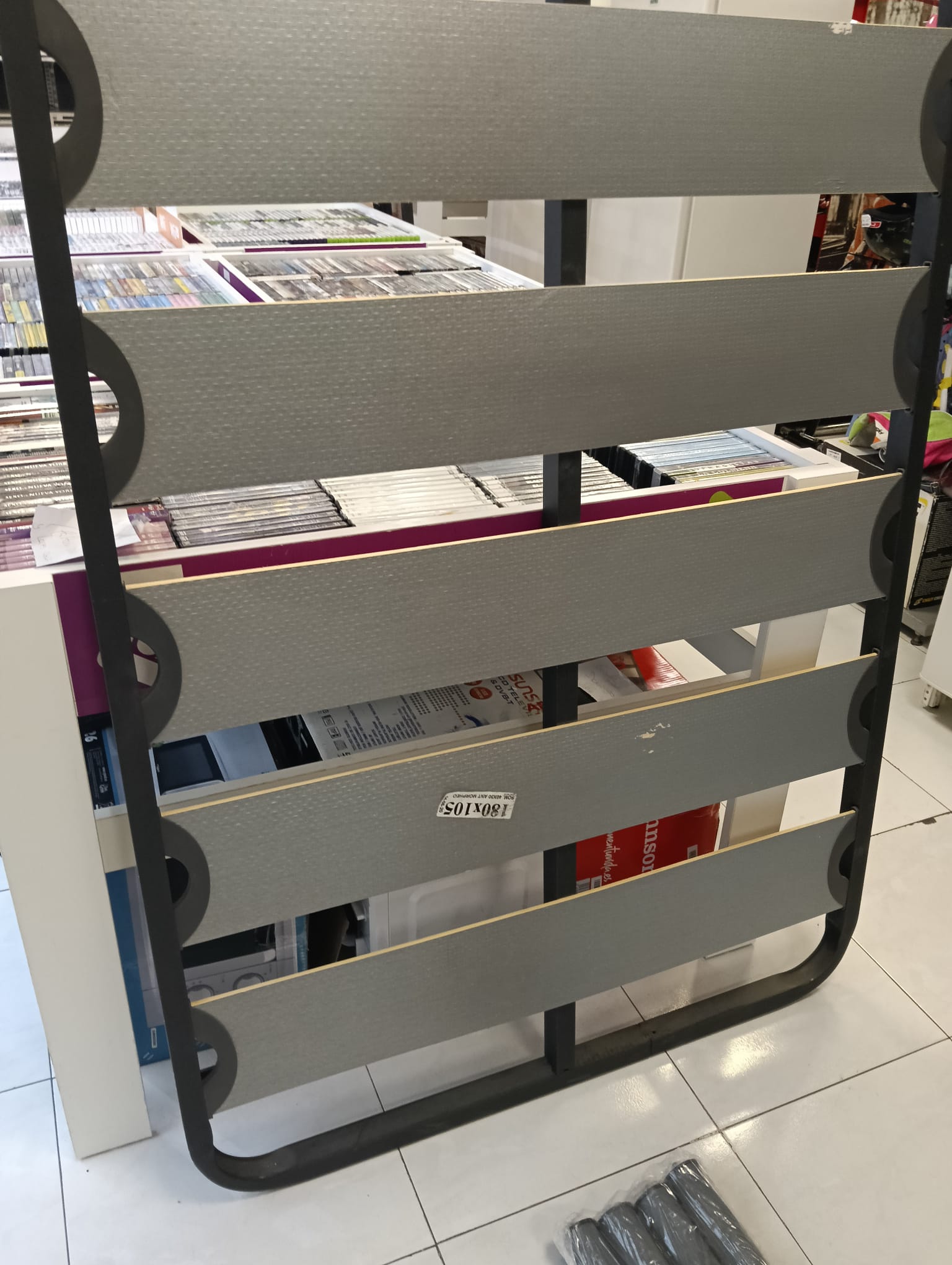 Somier de lamas en color negro y gris, con estructura metálica y lamas de madera. Medidas: 105x180 cm. Diseño moderno y funcional.