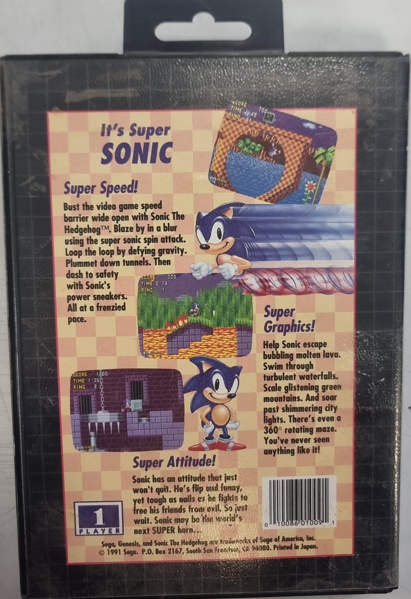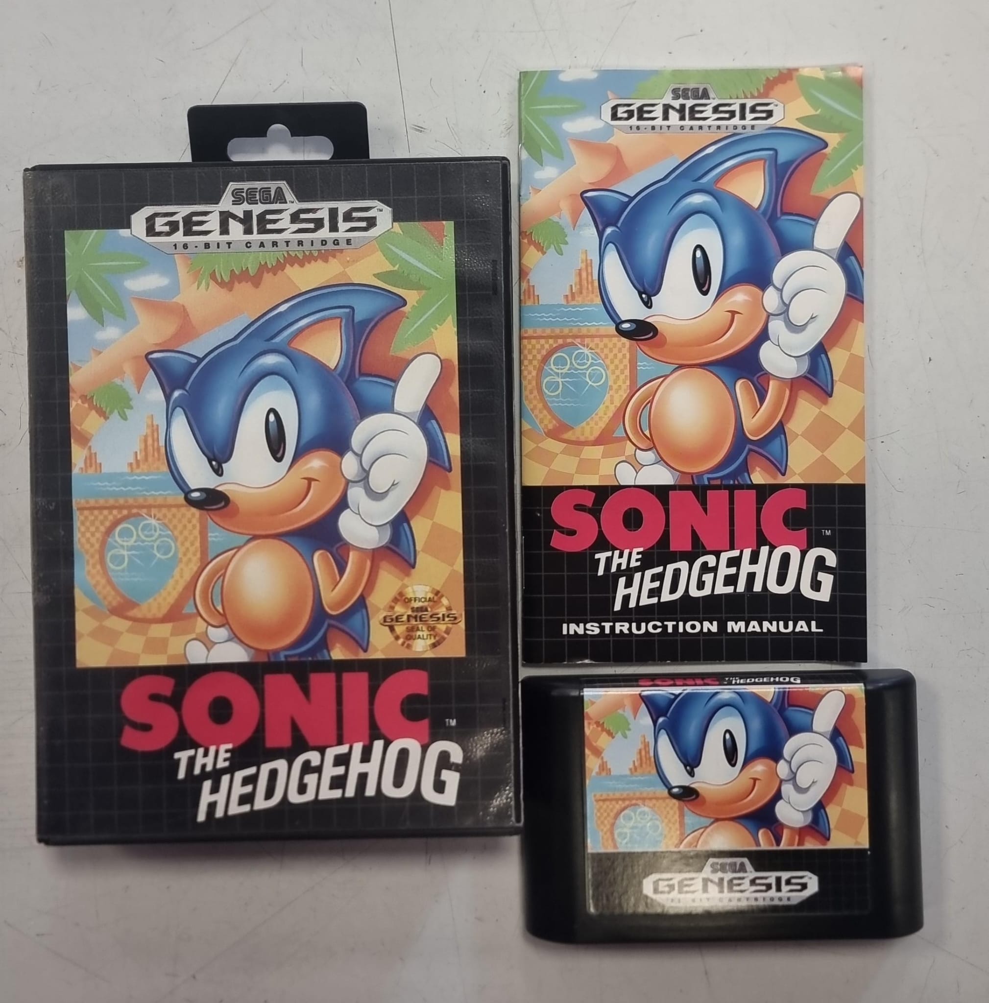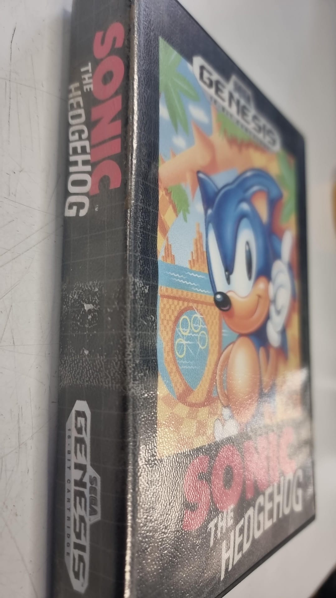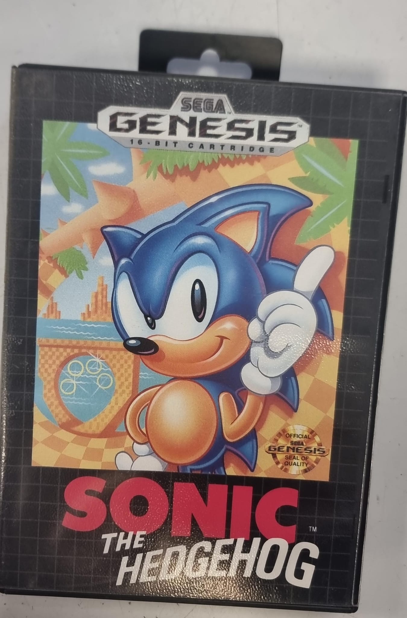 Cartucho del clásico juego Sonic the Hedgehog para Sega Genesis. Juego de plataformas.