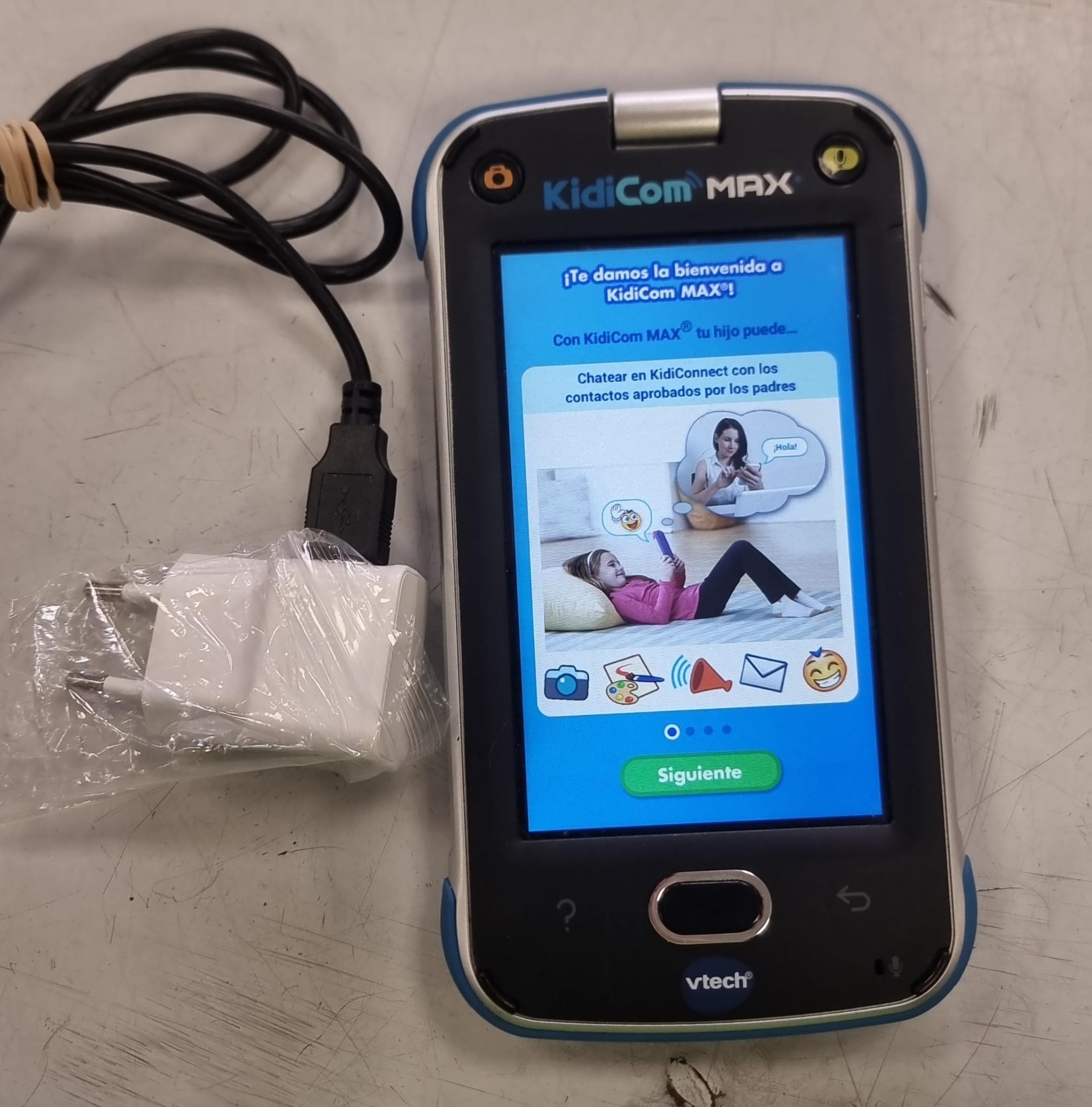 Tablet Vtech KidiCom MAX en color negro y azul, diseñada para niños. Permite chatear con contactos aprobados por los padres. Pantalla táctil. Cámara integrada. Conexión para cargador.