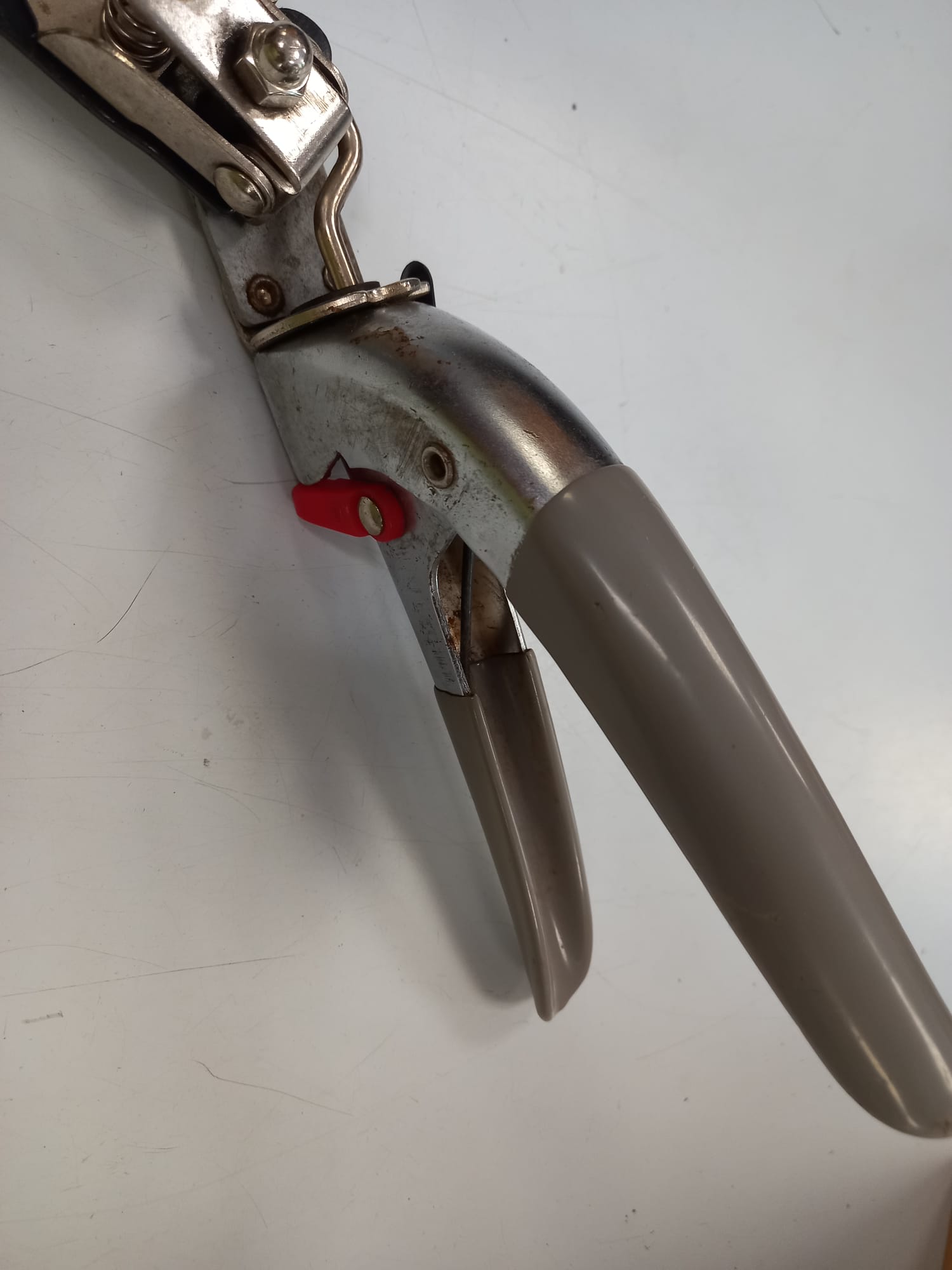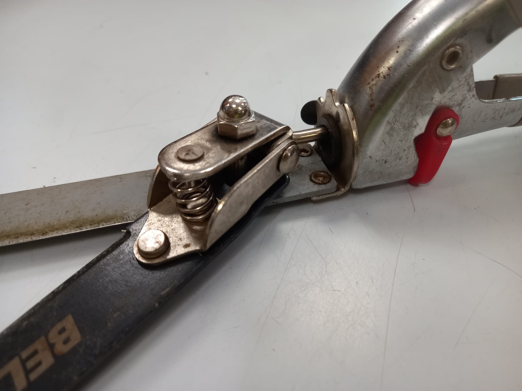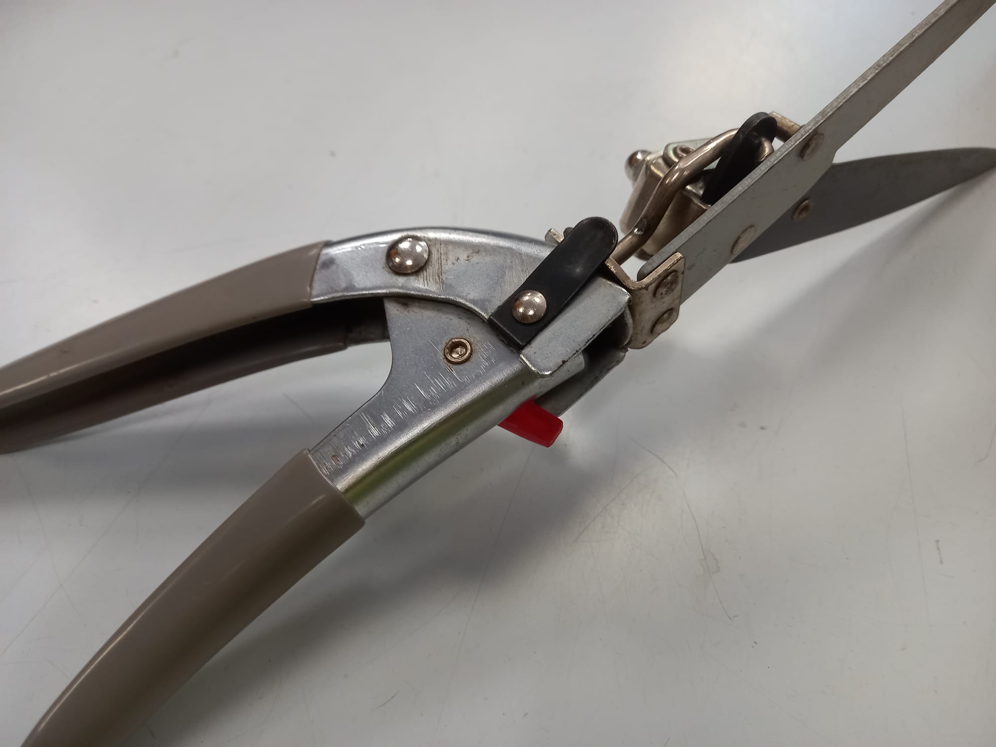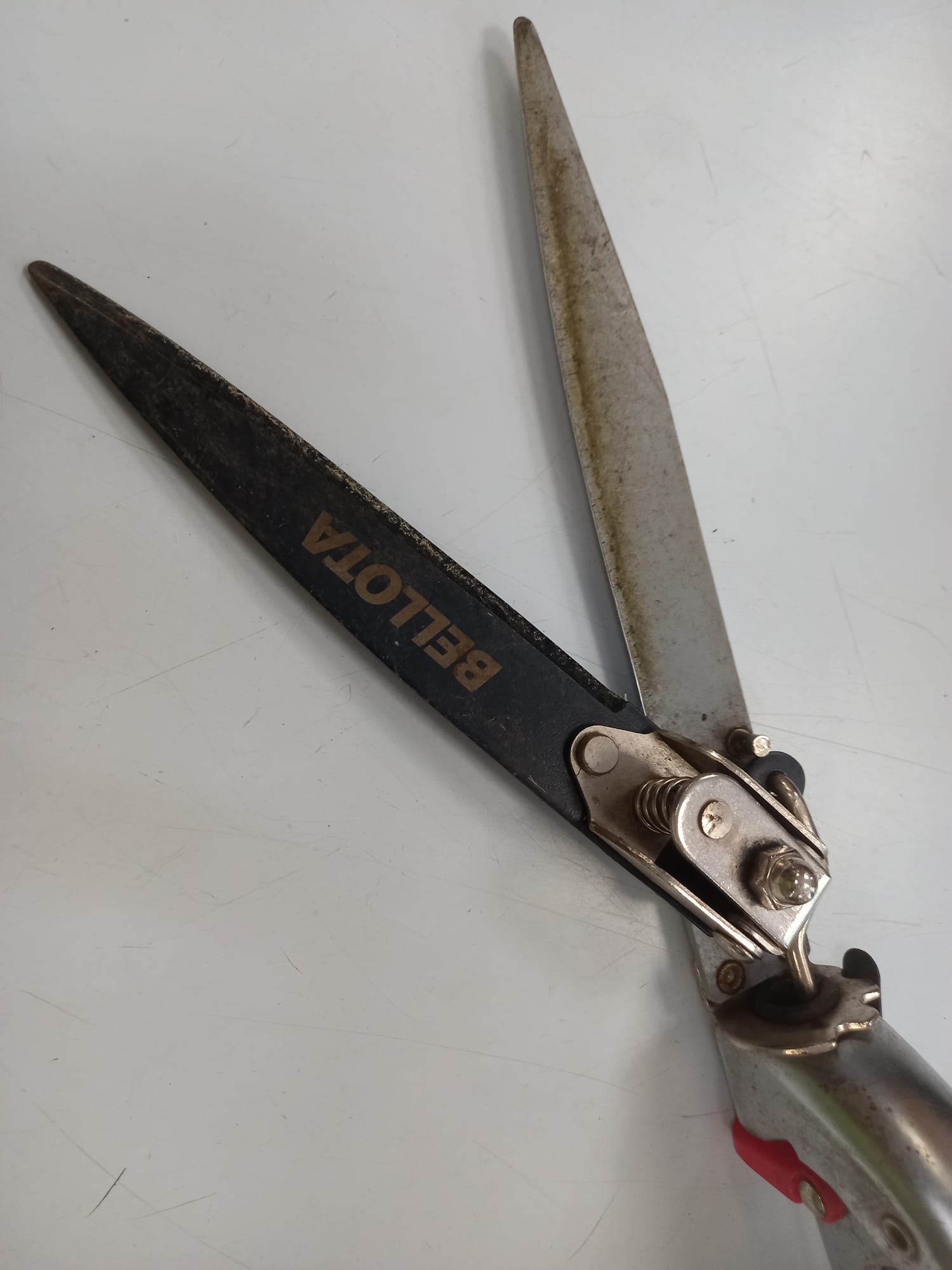 Tijeras de cortar césped manuales de la marca Bellota. Son de color gris y parecen estar en buen estado, aunque muestran señales de uso. Perfectas para el cuidado del jardín. Diseño manual.