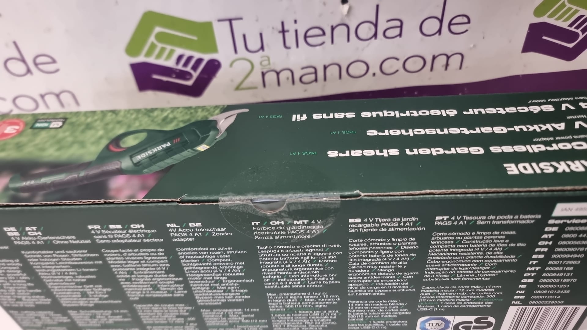 Tijera de jardinería inalámbrica Parkside.Modelo: PAGS 4 A1 Voltaje: 4V Tecnología: Li-Ion