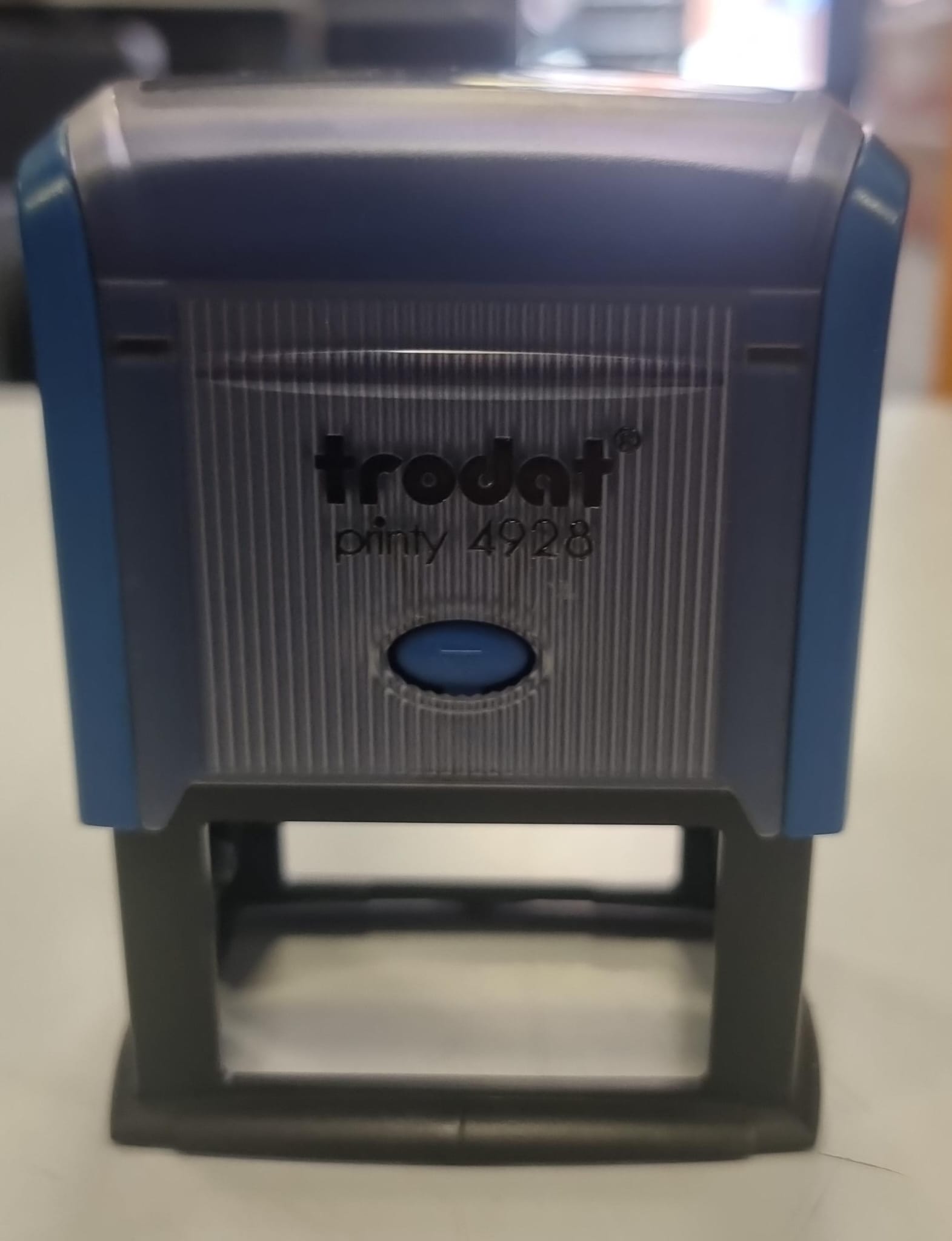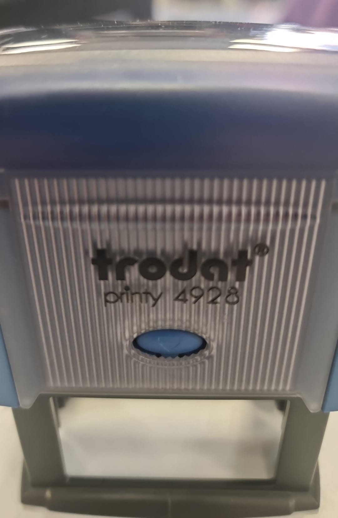 Sello automático Trodat Printy 4928.Diseño moderno y funcional. Color azul y gris.