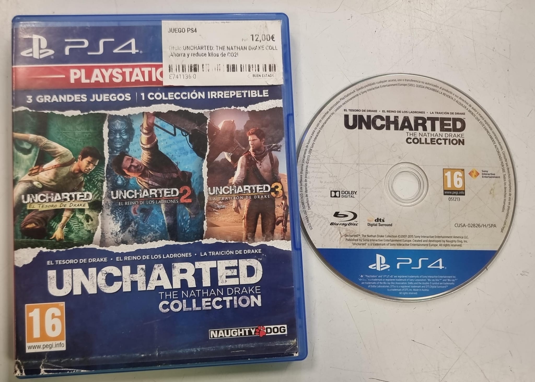 Colección de juegos Uncharted para PlayStation 4. Incluye El Tesoro de Drake, El Reino de los Ladrones y La Traición de Drake.