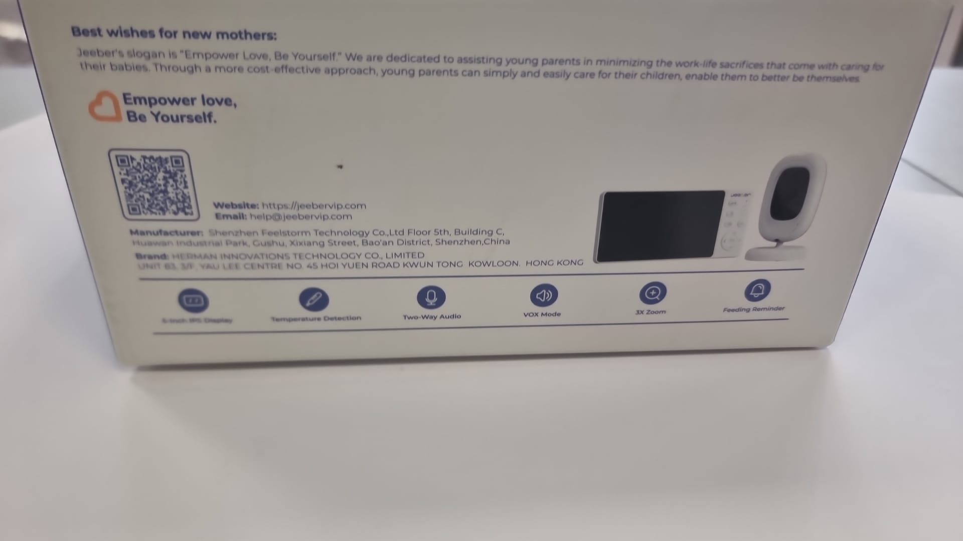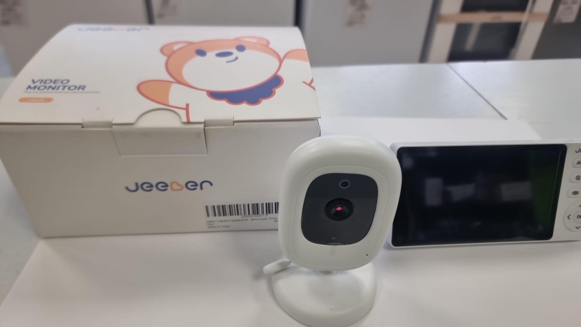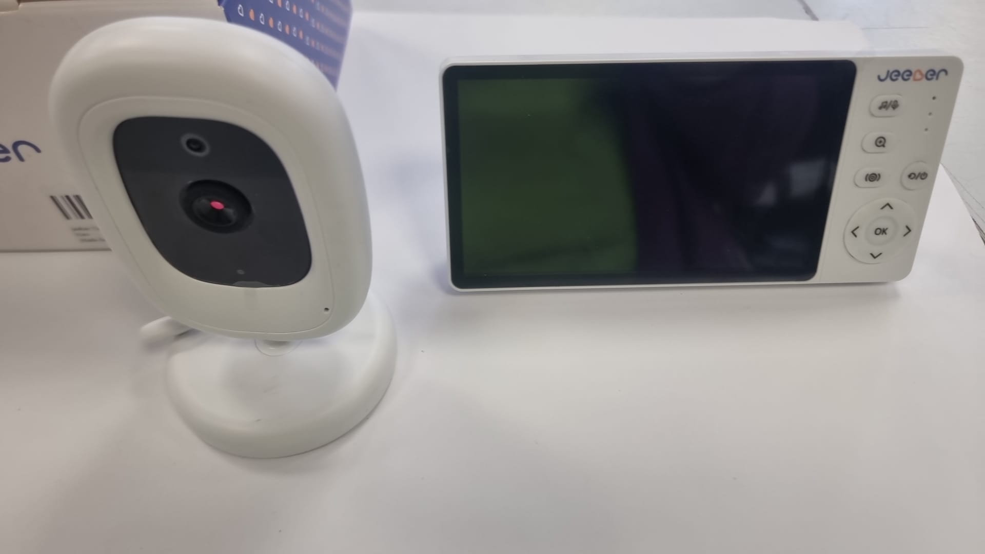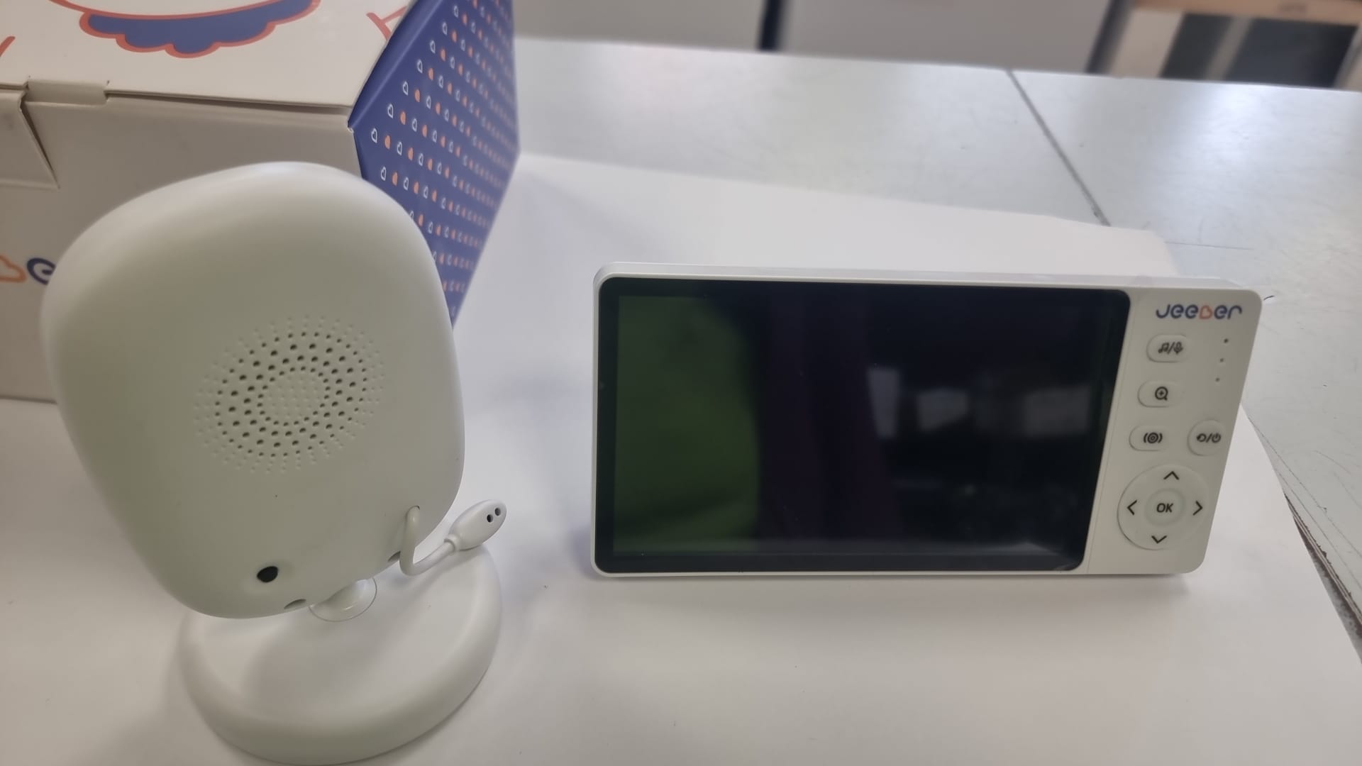 Vigilabebés Jeeber VB619 con cámara y monitor. Cámara blanca con base Monitor con pantalla a color. Botones de navegación y OK.