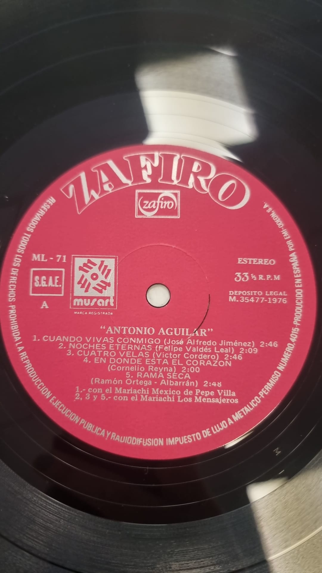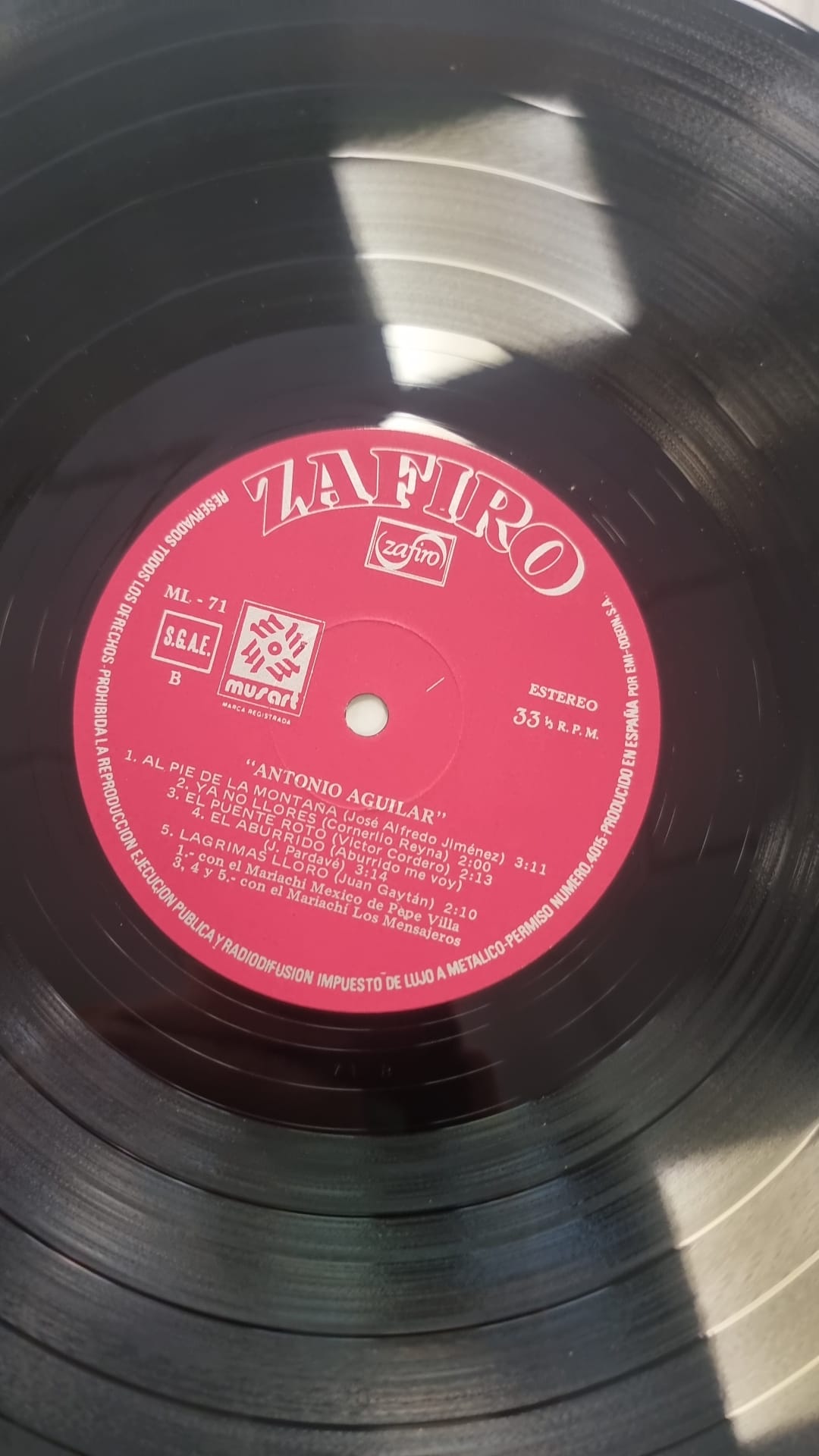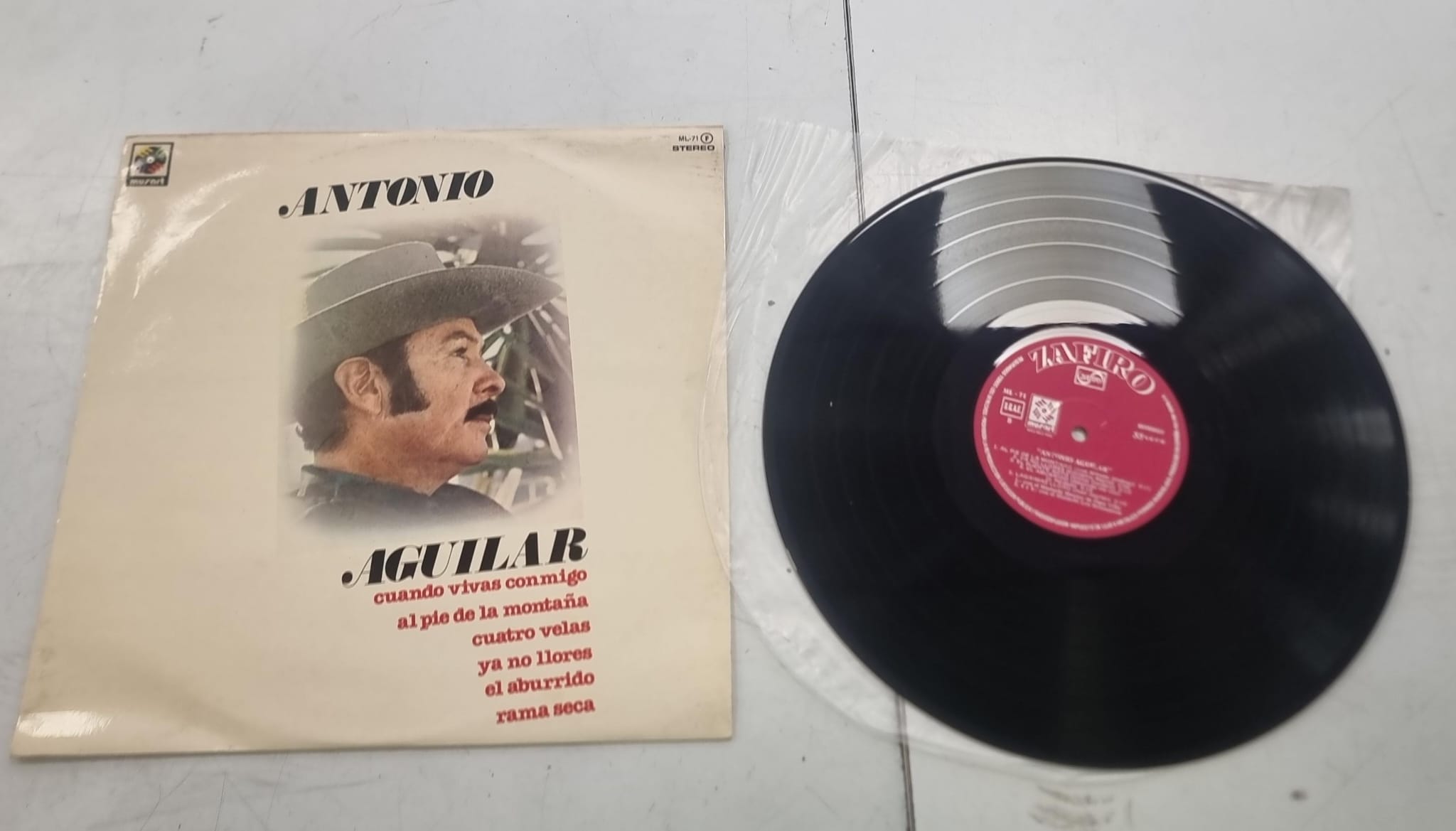 Disco de vinilo de Antonio Aguilar en excelente estado. Incluye el álbum completo. Álbum: Antonio Aguilar. Canciones: cuando vivas conmigo, al pie de la montaña, cuatro velas, ya no llores, el aburrido, rama seca. Género: Música Latina.