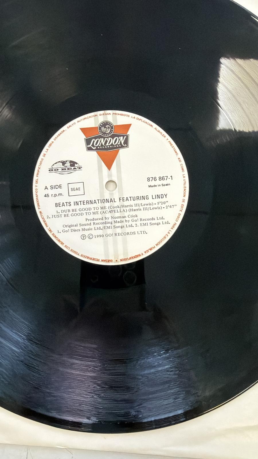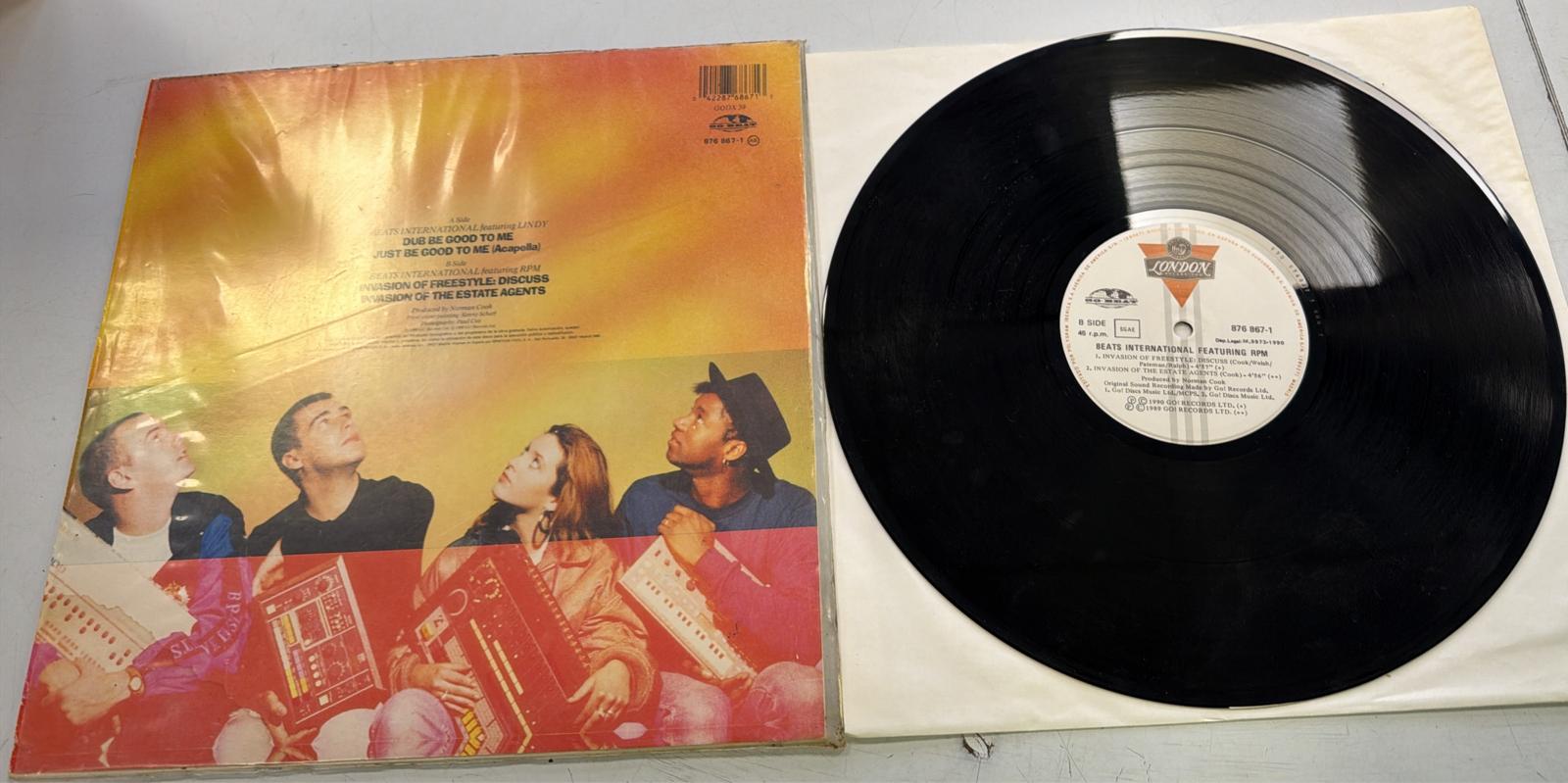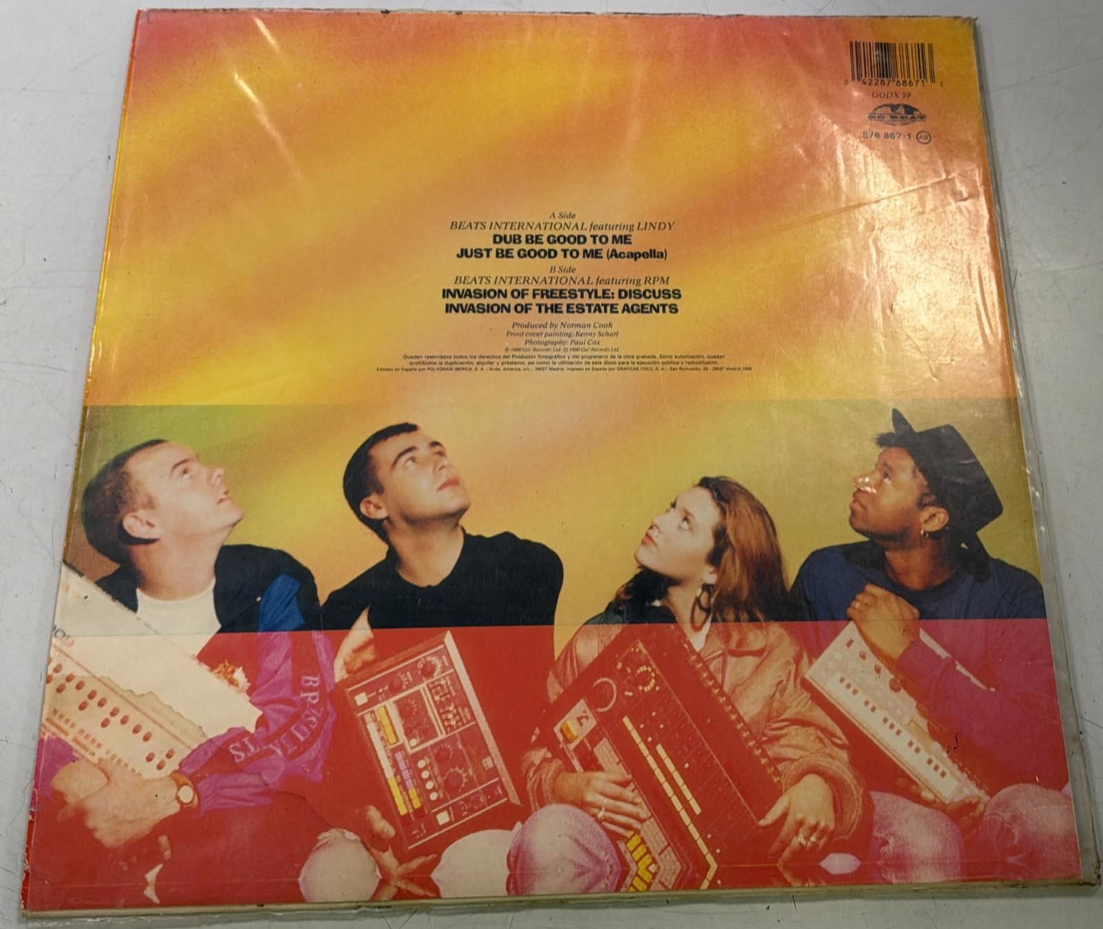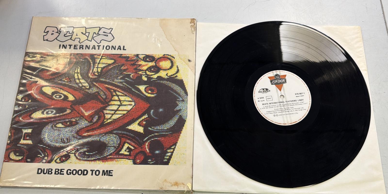 Vinilo del sencillo Dub Be Good To Me de Beats International.Sencillo de 12 pulgadas. Incluye la canción Dub Be Good To Me y Dub Be Good To Me (Instrumental). Signos visible de uso.
