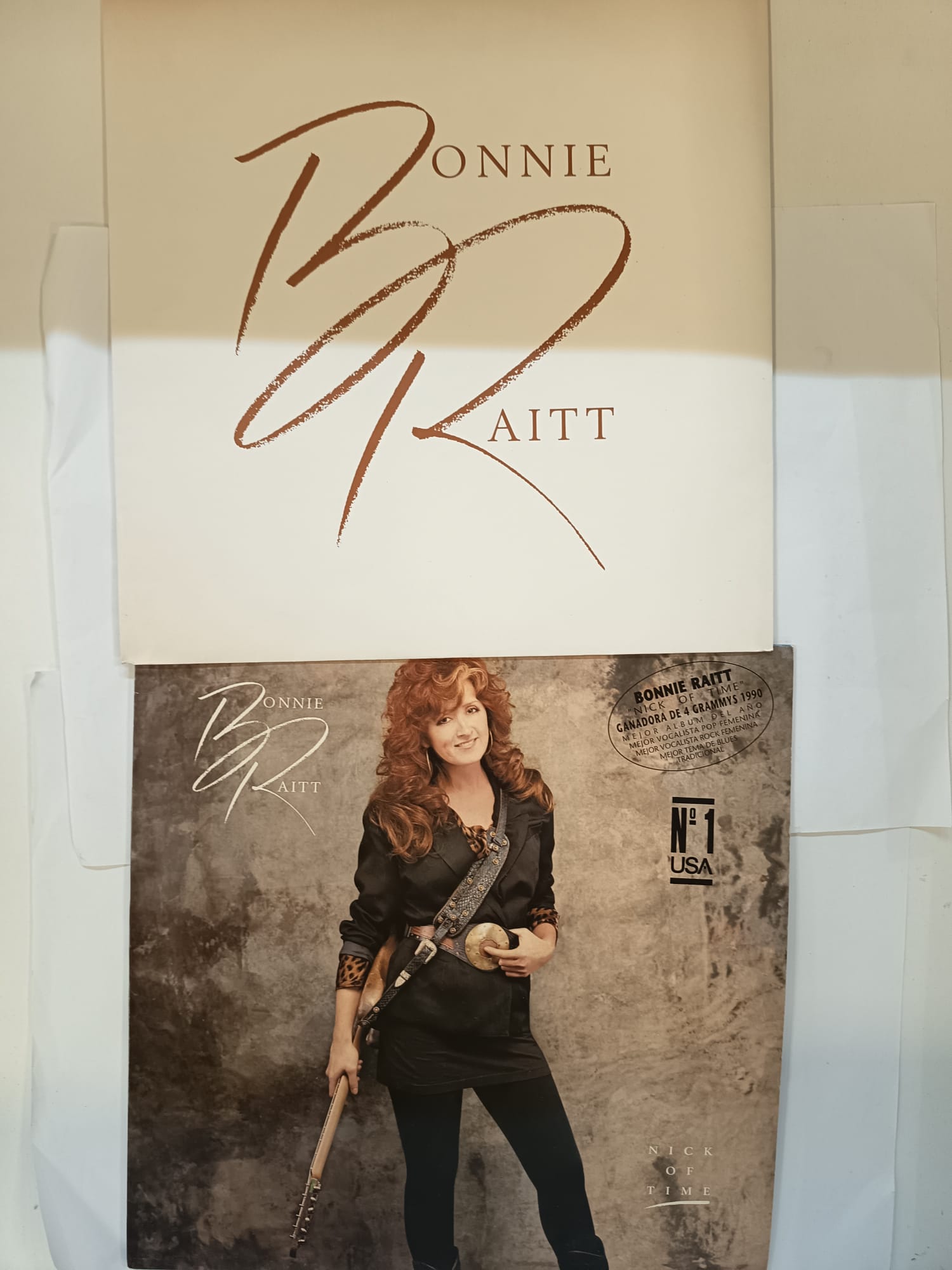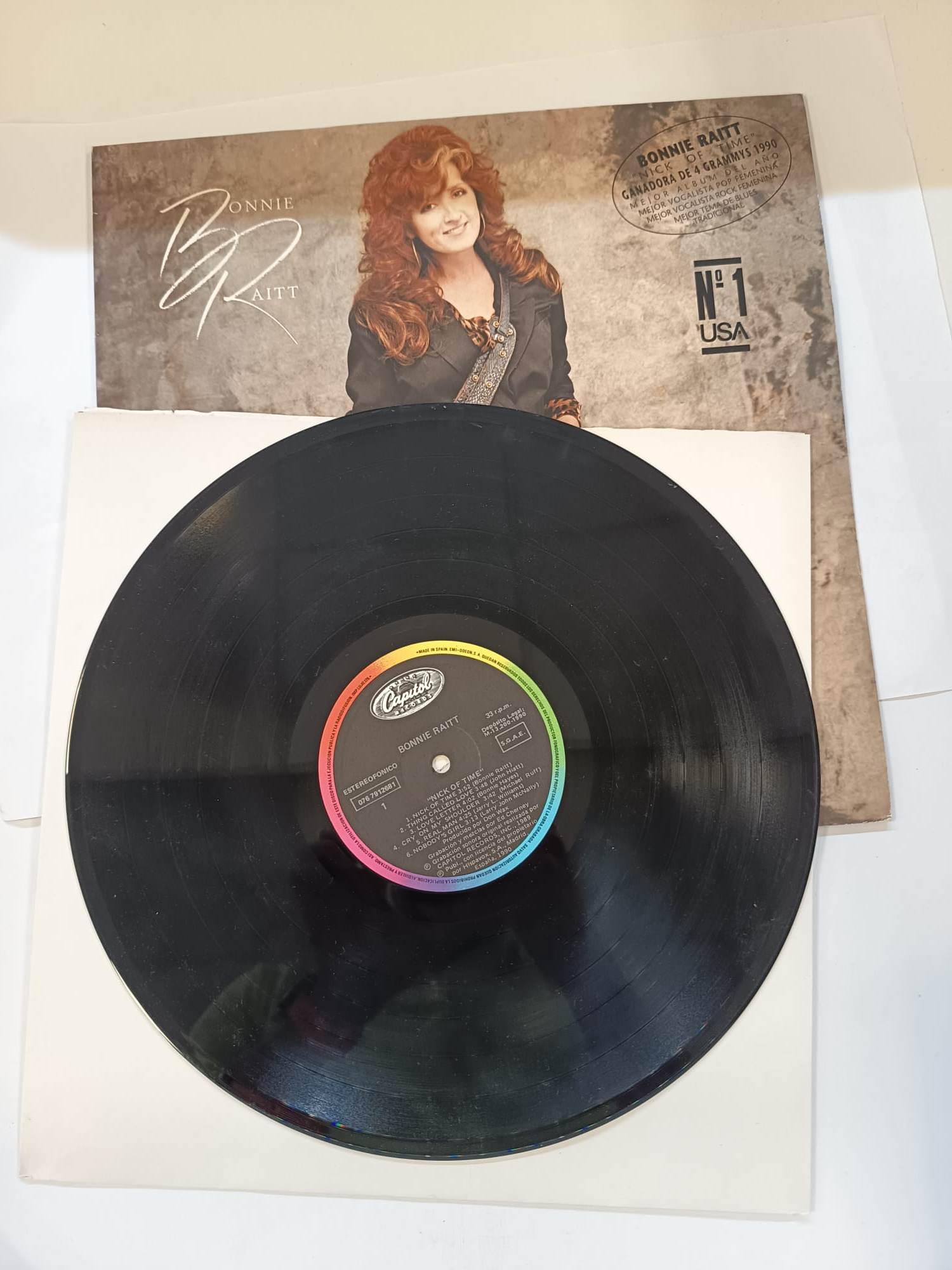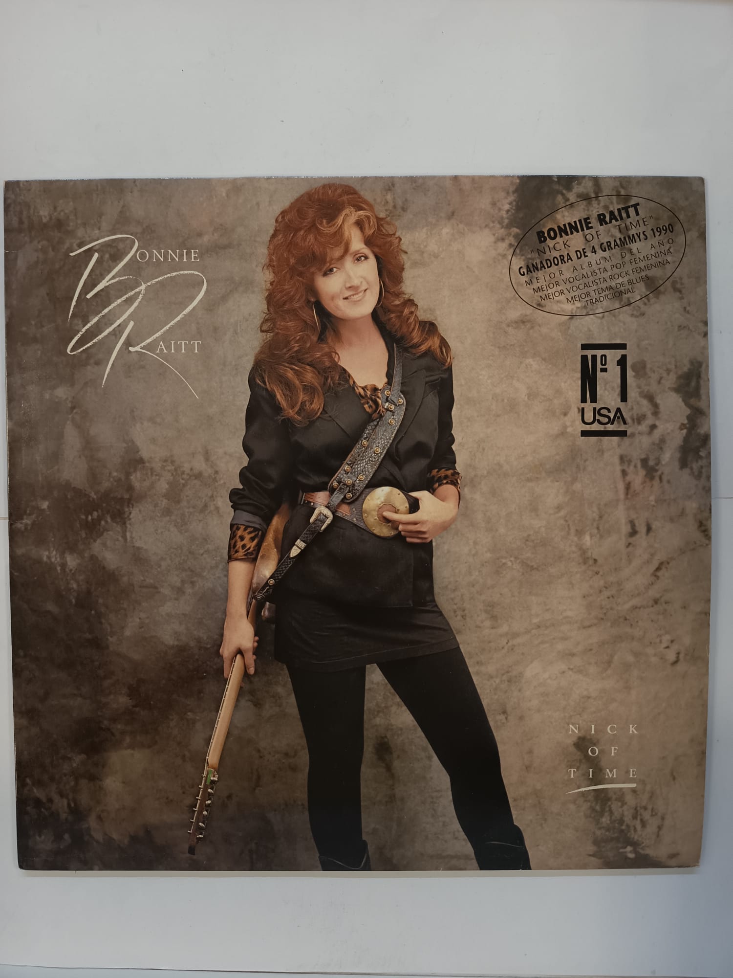 Vinilo del álbum Nick of Time de Bonnie Raitt. Ganadora de 4 Grammys en 1990.Premiada como Mejor Álbum del Año. Reconocida como Mejor Vocalista Pop Femenina.