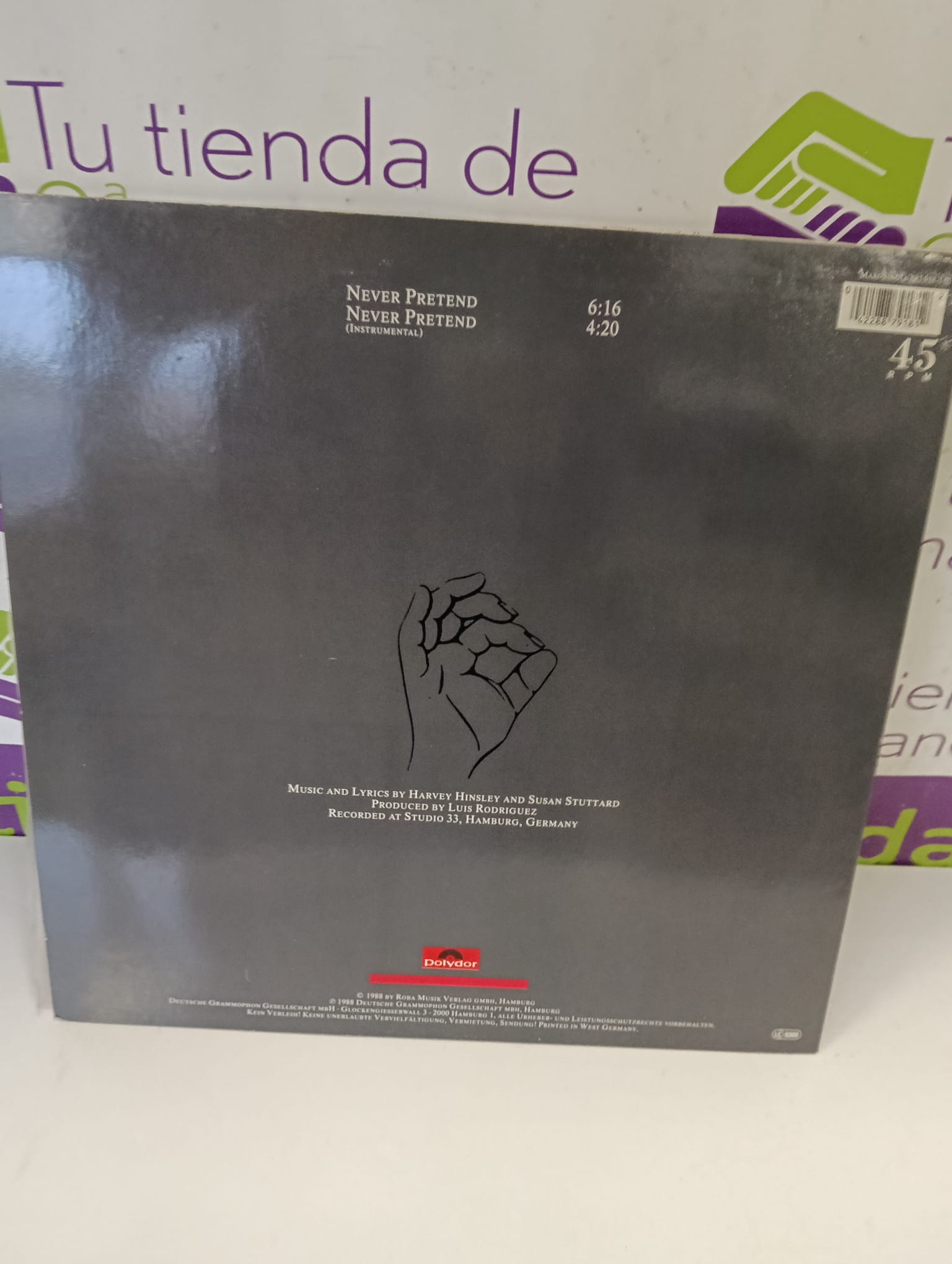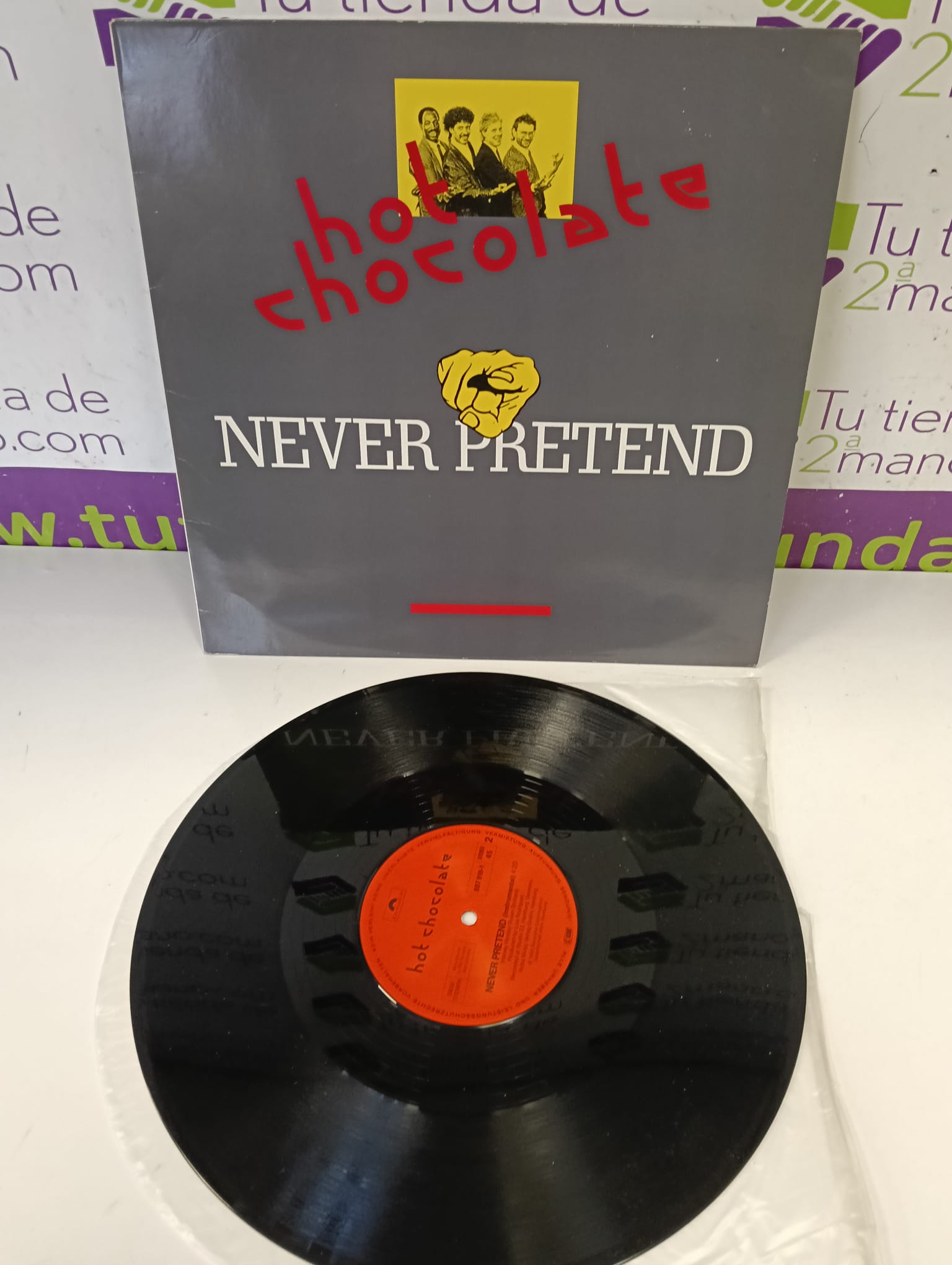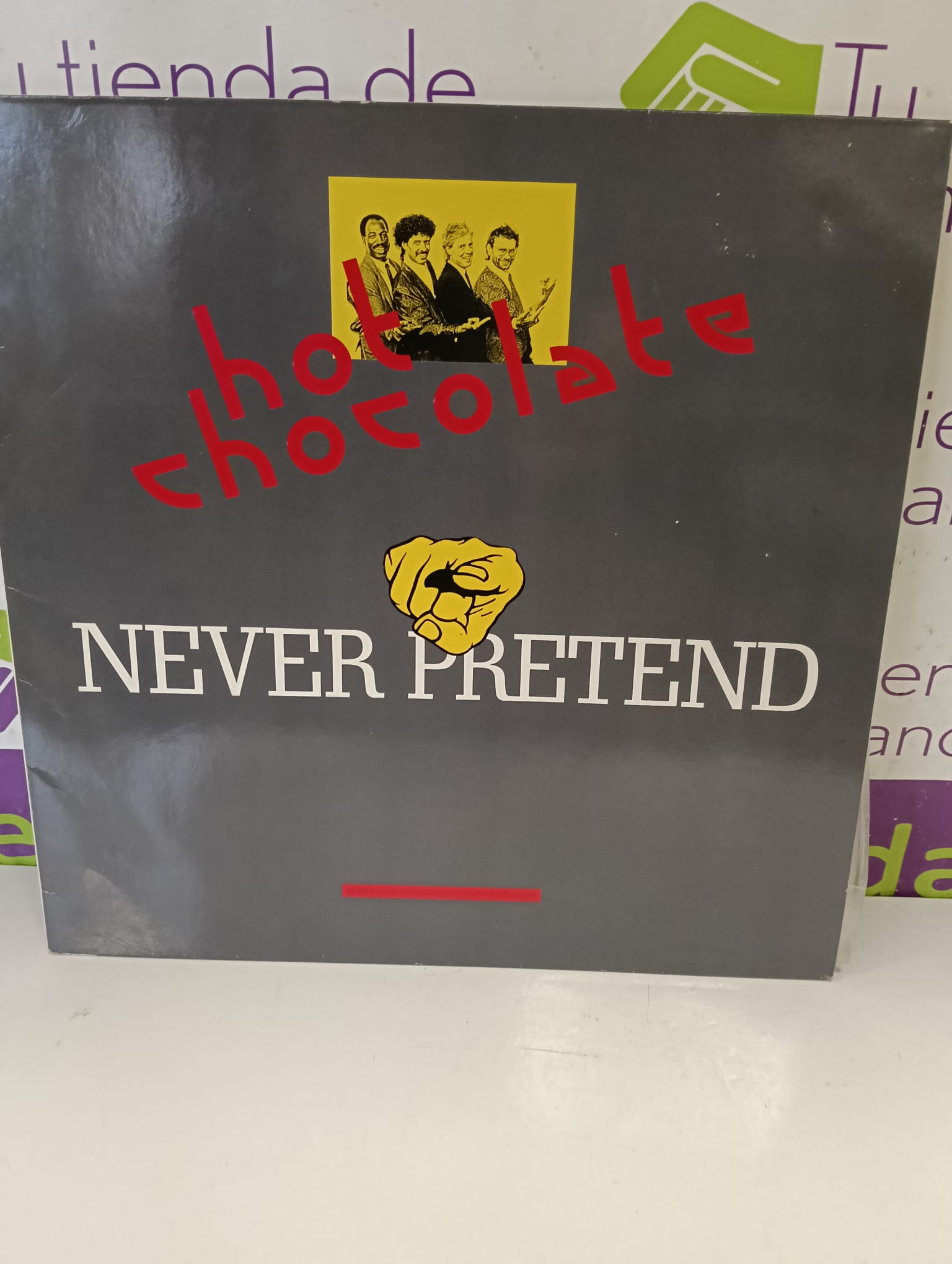 Vinilo del grupo Hot Chocolate, título Never Pretend.Portada con fotografía del grupo.Diseño gráfico distintivo. Signos visibles de uso.