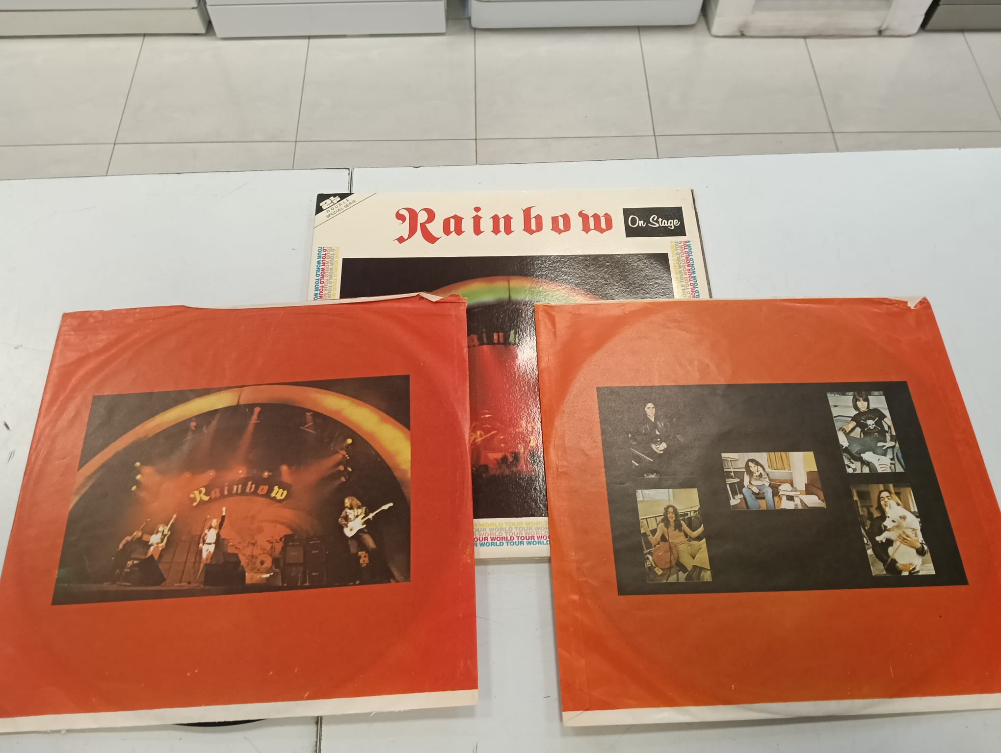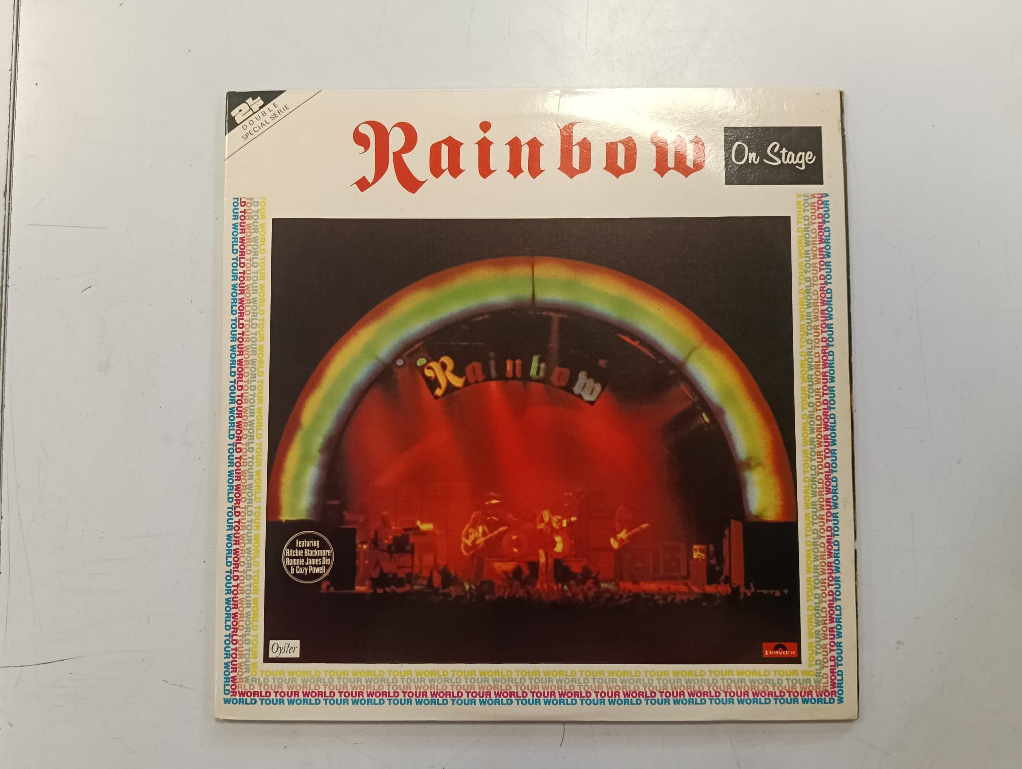 Vinilo del álbum On Stage de Rainbow. Edición especial. Incluye World Tour en el lateral. Presenta a Ritchie Blackmore, Ronnie James Dio y Gary Powell. Signos visibles de uso.