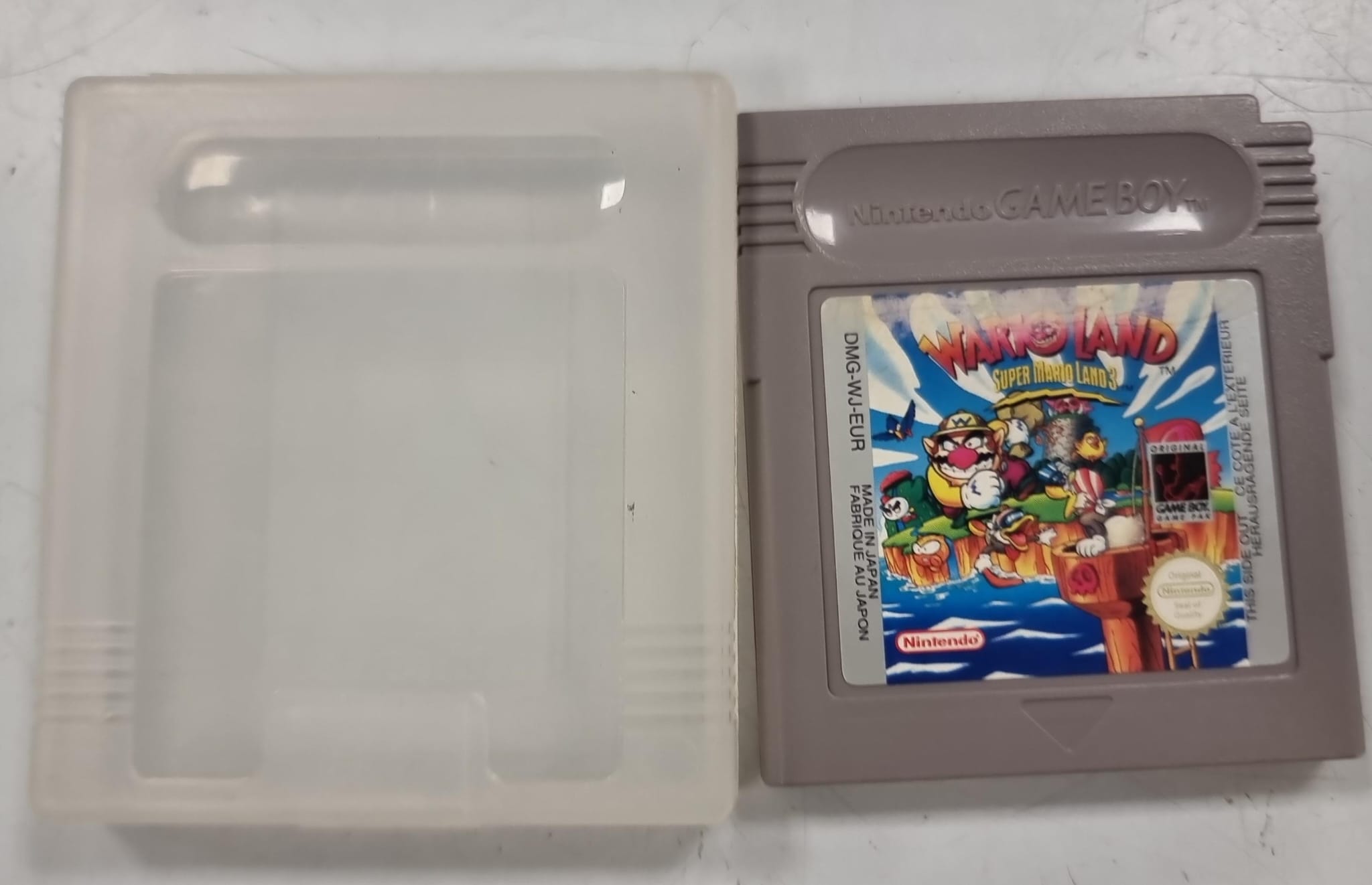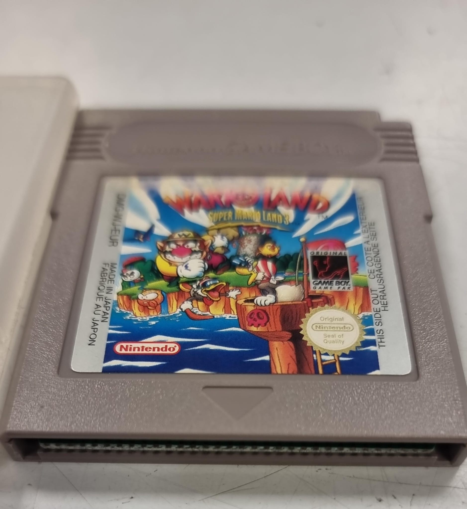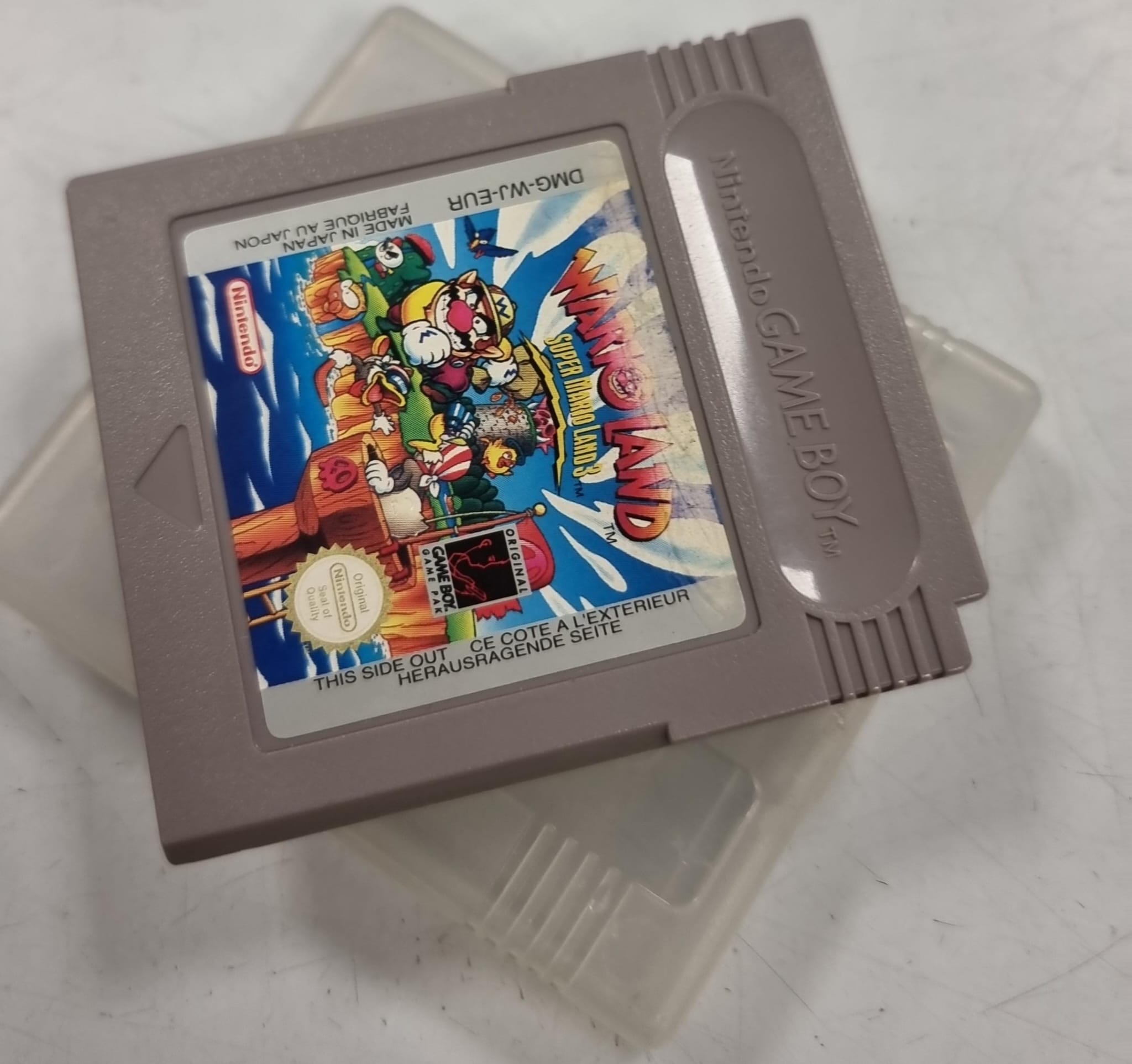 Cartucho de juego Wario Land 3 para Game Boy. Cartucho gris. Etiqueta con arte del juego.Fabricado en Japón.